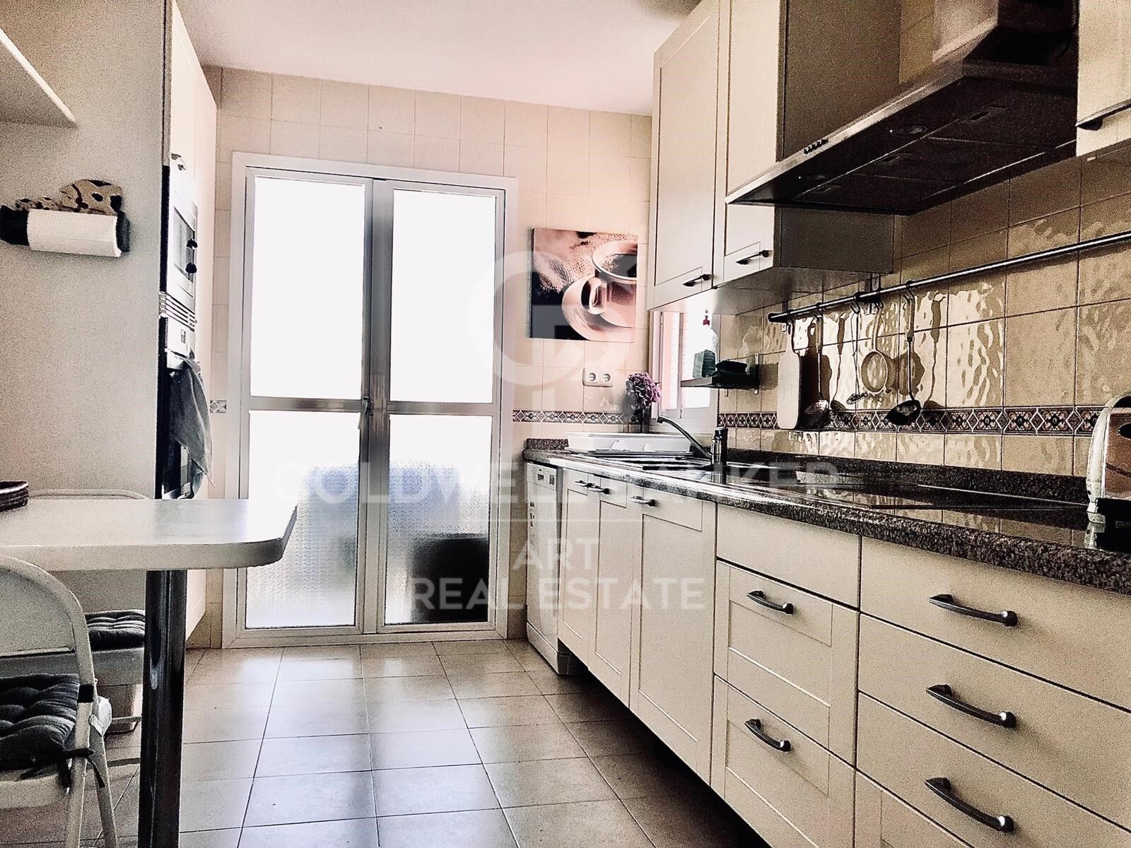The property features three bedrooms and three bathrooms, two of them en suite with private access to the terrace. The second bedroom has been extended to include a terrace area, currently used as a third service bedroom but easily adaptable into a separate bedroom and office.