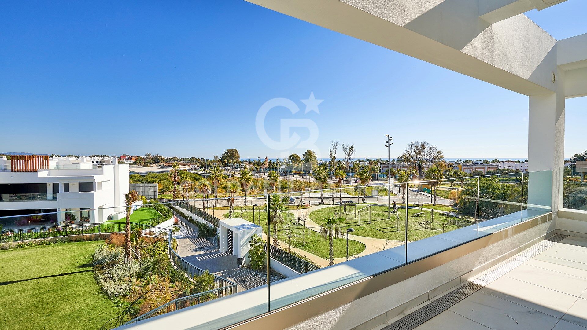 Los Miradores del Sol is an exclusive residential complex located in Estepona, known for its modern and avant-garde architecture. The project is arranged around a large central landscaped plaza, featuring lawns, trees, and carefully designed green spaces that create a natural and relaxing environment. At the heart of the complex are communal swimming pools and jacuzzis for both adults and children, as well as a children's play area, perfect for enjoying with the family.