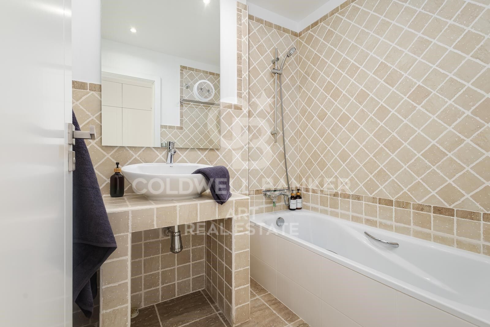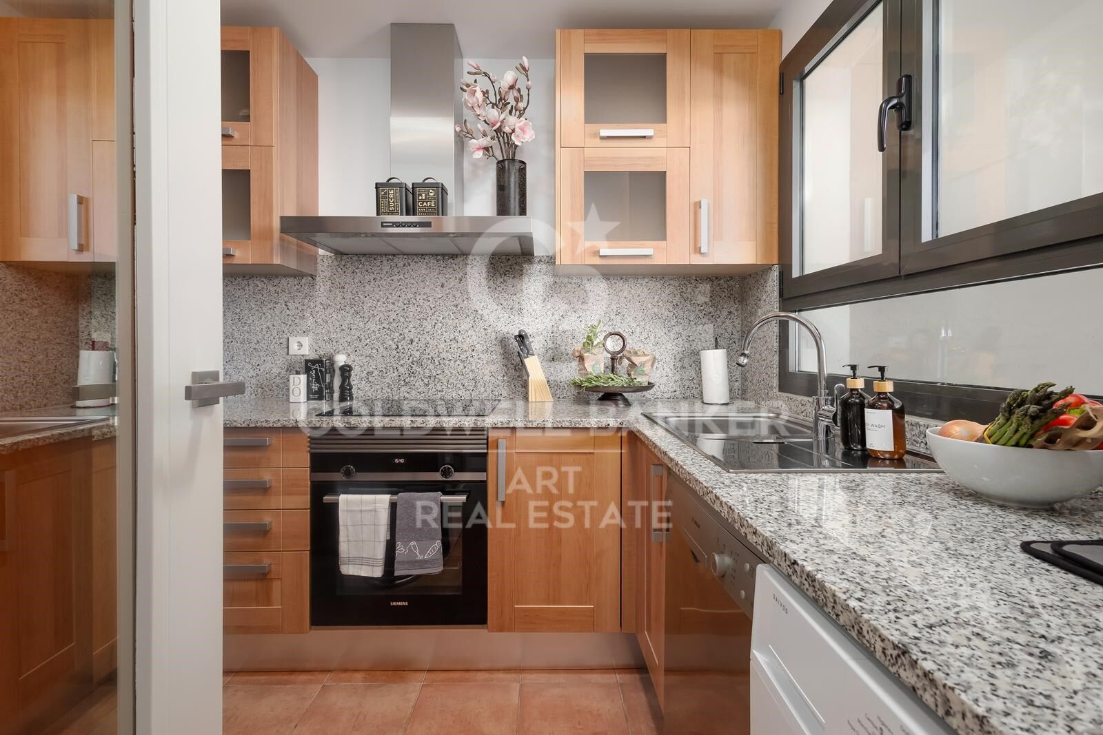 The bright and airy living and dining area is ideal for both everyday comfort and entertaining, with large sliding doors that open onto the terrace. The separate, fully equipped kitchen features sleek cabinetry and offers a highly practical space for cooking and hosting.