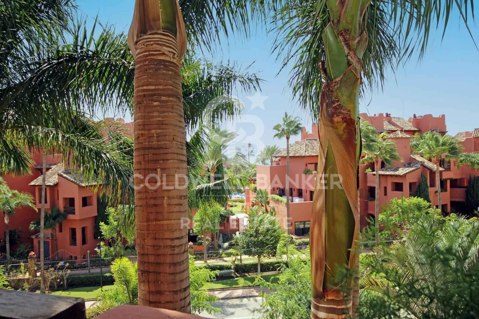 Spacious and filled with natural light, the apartment features an impeccable layout designed for comfort and easy living. The large, independent kitchen includes a practical covered terrace, ideal as a laundry or utility area. The expansive living and dining room opens directly onto a private terrace, where you can relax while taking in serene views of lush tropical gardens and a glimpse of the Mediterranean.
