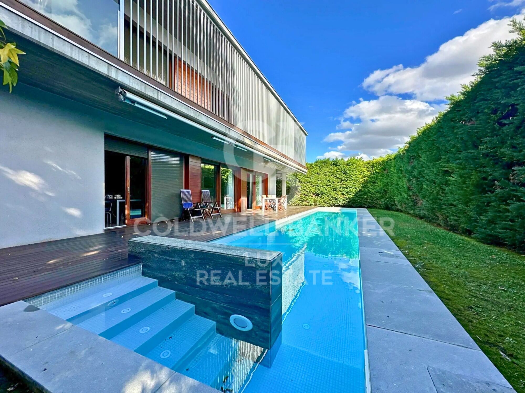 The landscaped garden surrounds the property, with lush vegetation and a 17.5-meter swimming pool. There is a garage for a large car and several motorbikes, along with multiple outdoor parking spaces.