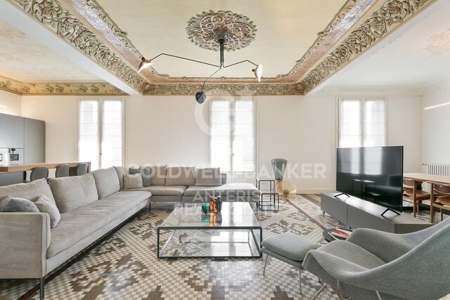 Discover this spectacular flat for rent of 120 m2, with 2 bedrooms and 2 bathrooms in the emblematic Casa Bures, where privacy and comfort merge in an exclusive environment that preserves the charm and elegance of the early twentieth century. Upon entering the flat, we discover an impressive living-dining room where the ceiling has been maintained with original decorative elements of the period; the open plan kitchen, fully equipped, is perfectly integrated into the environment. The large gallery overlooking the courtyard provides the day area with incredible natural light. From the living room we access the master suite with its complete bathroom, which also has access to the gallery. The property also has another complete bathroom and an additional double bedroom. Equipped with high-end appliances and elegantly furnished, this property offers an incomparable atmosphere of luxury and style. Casa Burés is more than just a building, it is an icon of Catalan modernisme, built between 1900 and 1905 by some of the most important craftsmen of the time. Its location in Barcelona's Eixample district, one of the city's most emblematic areas in terms of modernista architecture, makes it a privileged place to live. The restoration carried out between 2015 and 2017 has preserved all the listed decorative details, maintaining the essence and authenticity of this magnificent building. The communal areas of the Casa Burés building add an extra touch of luxury and exclusivity to this exceptional property. With access to complete communal areas, including a heated outdoor swimming pool on the upper terrace, an indoor pool, gymnasium, entertainment room, home cinema and work area on the ground floor, residents can enjoy a variety of leisure and relaxation options without leaving home. In addition, concierge and security services are provided 24 hours a day, 365 days a year to ensure the peace of mind and security of all residents. #ref:CBES2355