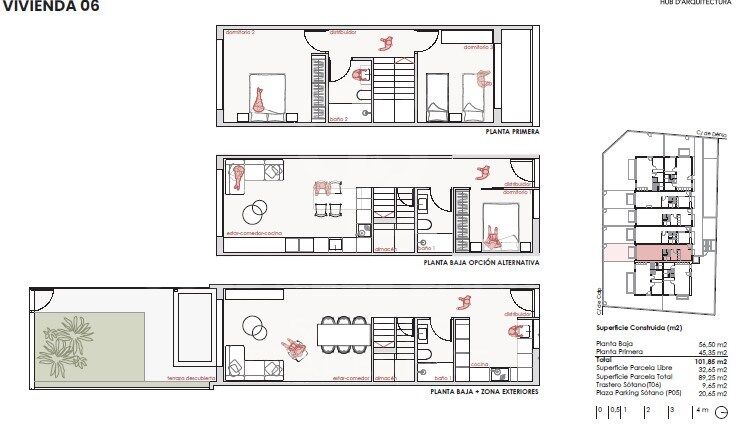 4 corner homes: 3 bedrooms, 3 bathrooms, larger gardens, optional swimming pool (except GT-02). Two of them (GT-01 and GT-08) include parking and storage room in the basement with direct access.