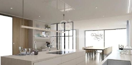 views to the garden and the swimming pool. The kitchen is fully equipped with high-end appliances and has a central island and dining area connected to the outside.