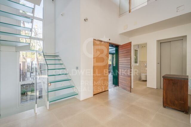 COLDWELL BANKER is pleased to present this wonderful designer house, completely renovated in 2012, ready to move into! The house has 429 m2 built on a 1,000 m2 plot. It faces south and has beautiful views of Tibidabo. It is located just a 12-minute walk from the Bellaterra station and shopping area, and a 3-minute drive away, in an area with magnificent newly built neighboring homes. When the owners acquired the house, they underwent a radical renovation, both inside and out, under the direction of YLAB Arquitectos. The foundations were re-laid, and the structure and interior layout were changed, opening up the spaces and replacing brick walls with glass and sliding doors, creating the stunning designer home we see today. As we enter the property, we are greeted by a lush, well-kept garden. Before entering the home, a unique window opens up, revealing the interior. Once inside, we feel immersed in the garden thanks to the large glass openings on both sides. The hall, located in a central area of the floor plan, facilitates access and horizontal and vertical communication between the floors. It presents two distinct areas: a very spacious living room opens to the right, with the dining room and kitchen at the far end. The entire space is unified by a luminous, light-colored porcelain floor, highlighted by a large fireplace. Straight lines and fine materials are the key elements. There are no dividing walls, but rather panels and sliding doors that connect or separate all the rooms. The house exudes style, comfort, and functionality. Returning to the hall, just on the opposite side, we find a large private area consisting of a bedroom with a dressing room and en suite bathroom, and a separate living room, also accessible from the garden and pool. There is also an office and library. The stairs leading to the different floors are also located in this area. In the garden, the undisputed centerpiece is a never-ending infinity pool. Accompanying it is a large terrace perfectly equipped for the hottest summer days, ready to host the most special moments. A barbecue area, a large sun terrace, and a chill-out area complete the outdoor leisure area. Specifically, the garden underwent a major renovation, with a series of terraces that neutralize the unevenness of the garden and allow access to the entire plot and maximize the views. The upper floor features two double bedrooms with en suite bathrooms and large floor-to-ceiling windows that provide plenty of light and south-facing views. One of the bedrooms also has a fully equipped dressing room and access to a pleasant terrace with panoramic views. There is also another single bedroom with an en suite bathroom and a spacious living room with several areas for a TV and an office, respectively. On the lower floor, there is a gym, a laundry room, a bathroom, and a two-car garage. The house has three independent automatic control systems: temperature control, remote security (cameras, alarms, connection to a security center), and home automation for curtains and lighting. Ducted air conditioning is provided in the living-dining room and split air conditioning (7 units) in the remaining rooms. Underfloor heating is provided by city gas. It has 24 solar panels that generate 100% of the daily consumption, generating a 60% surplus that creates electricity. It also has two solar thermal panels for hot water. Only the most avant-garde designs achieve the sensations this wonderful house provides. A privilege only a few can afford. LOCATION: Bellaterra is located in an elevated and sunny area, between the towns of Sant Cugat, Sabadell, Sant Quirze, and Cerdanyola. True to its origins, it has established itself as a prime residential area, with a family population residing year-round. Separated from the Collserola mountain range, Bellaterra faces the sea to the southeast and Montseny to the northeast. Its strategic location places it 12 minutes from Barcelona via the C-58 and 20 minutes from the AP-7 and B-30. This connectivity allows access to all desirable services. In less than 5 minutes, we can reach leading hospitals, universities (UAB, UIC, and ESADE), the most prestigious international schools (Ágora, Europa International School, Japanese School, Thau, Viaró, La Vall), shopping centers (IKEA, El Corte Inglés, cinemas), industrial estates (Can Sant Joan, etc.), and prominent sports centers. It offers the services typical of a small town, such as a pharmacy, bank, church, restaurants, sports club, and hair salon. mountain range, Bellaterra faces the sea to the southeast and Montseny to the northeast. Its strategic location places it 12 minutes from Barcelona via the C-58 and 20 minutes from the AP-7 and B-30. This connectivity allows access to all desirable services. In less than 5 minutes, we can reach leading hospitals, universities (UAB, UIC, and ESADE), the most prestigious international schools (Ágora, Europa International School, Japanese School, Thau, Viaró, La Vall), shopping centers (IKEA; El Corte Inglés, cinemas), industrial estates (Can Sant Joan, etc.), and prominent sports centers. It offers the services typical of a small town, such as a pharmacy, bank, church, restaurants, sports club, hair salon, pet shop, gas stations, among others. It also has two Generalitat railway stations. Everything you need to live in a natural environment without sacrificing immediate connection to the surrounding cities. #ref:CBSC216B