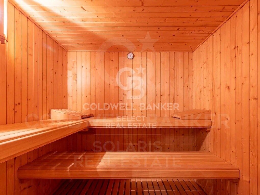 On the lower level there is a spacious spa room with a spectacular jacuzzi, comfortable sofas, bar, sauna and bathroom with shower. There is also a large dressing room.