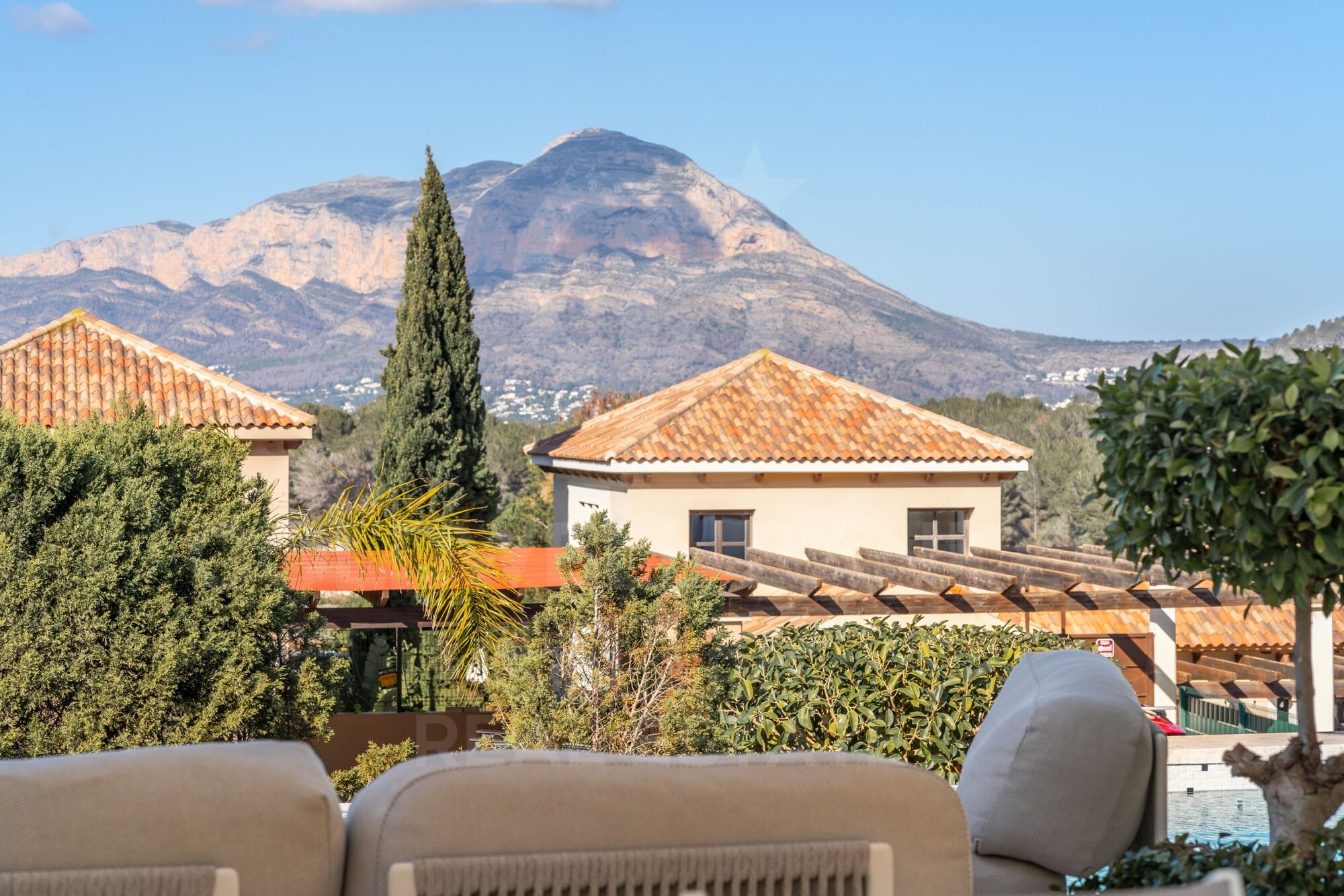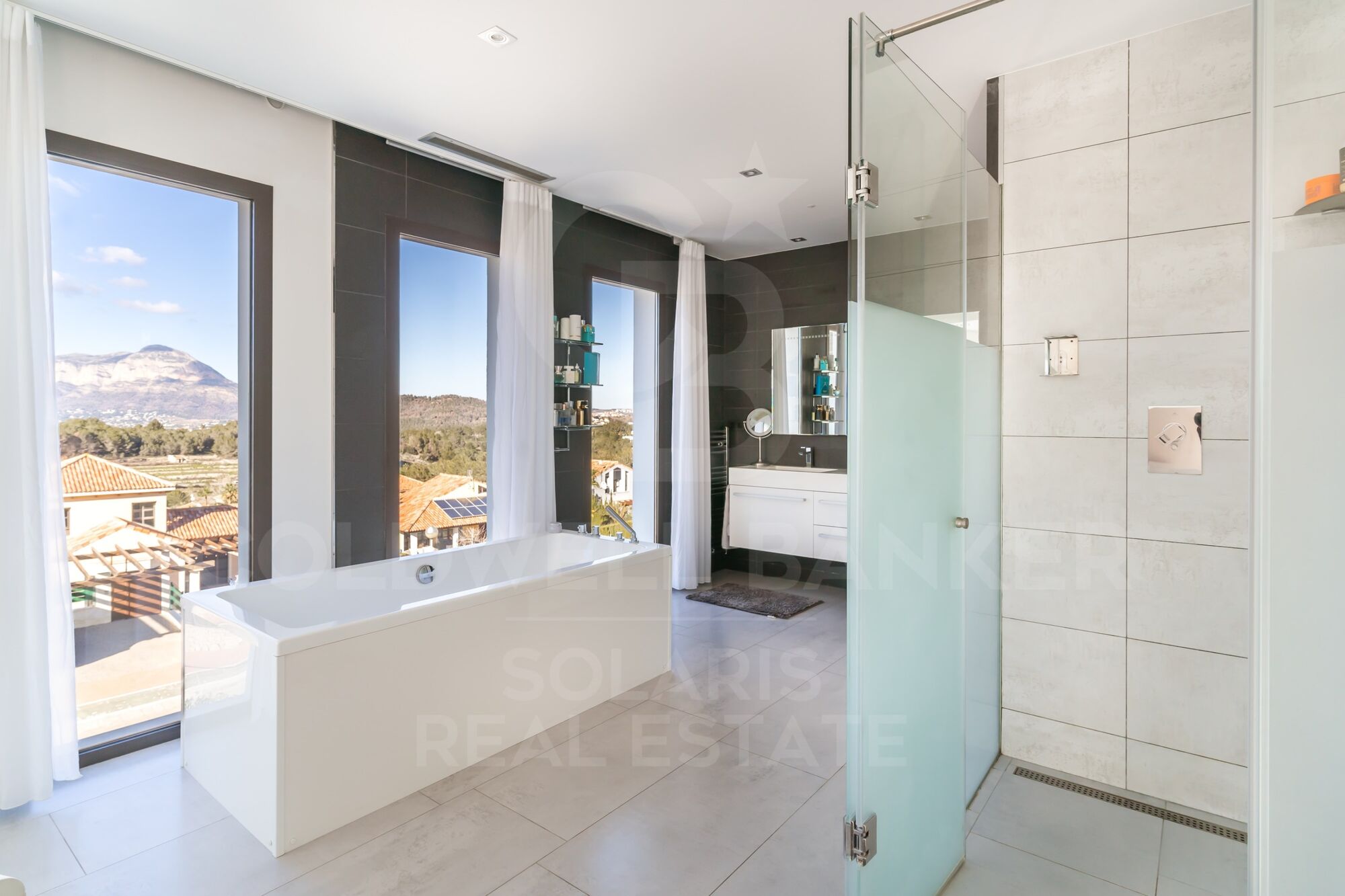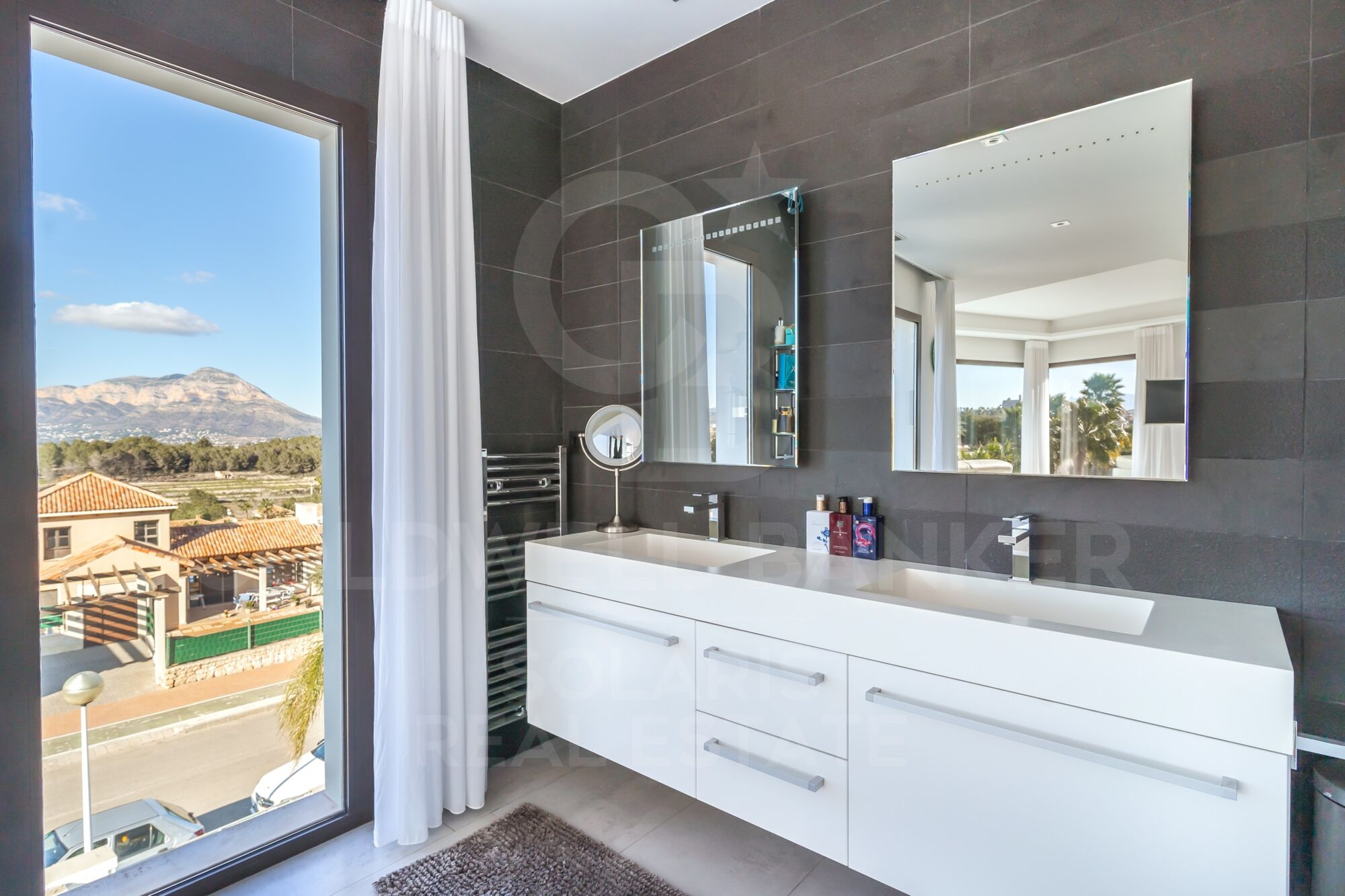 Inside, the villa features 5 luxurious en-suite bedrooms, each with its own private bathroom, designed with sophisticated details that combine comfort and style. The impressive living room, with its double height and large-format windows, floods the space with natural light and offers captivating panoramic views of the majestic Montgó, creating a unique atmosphere of connection with the surroundings.