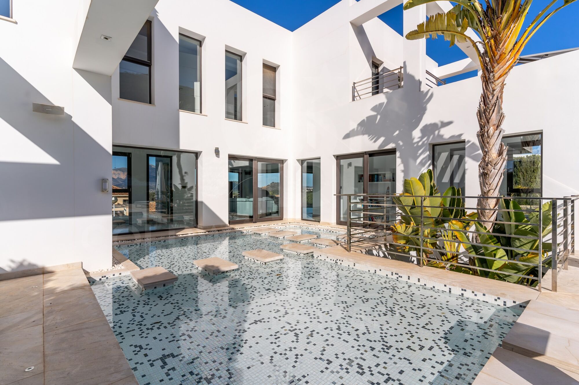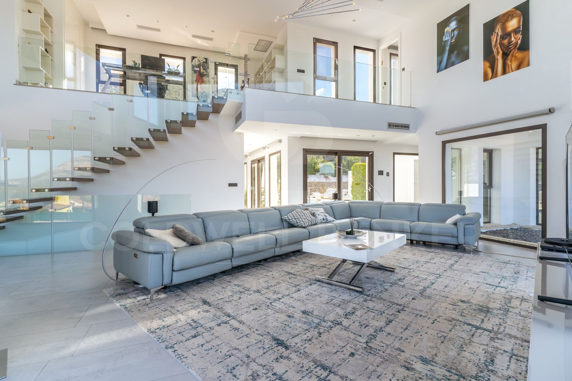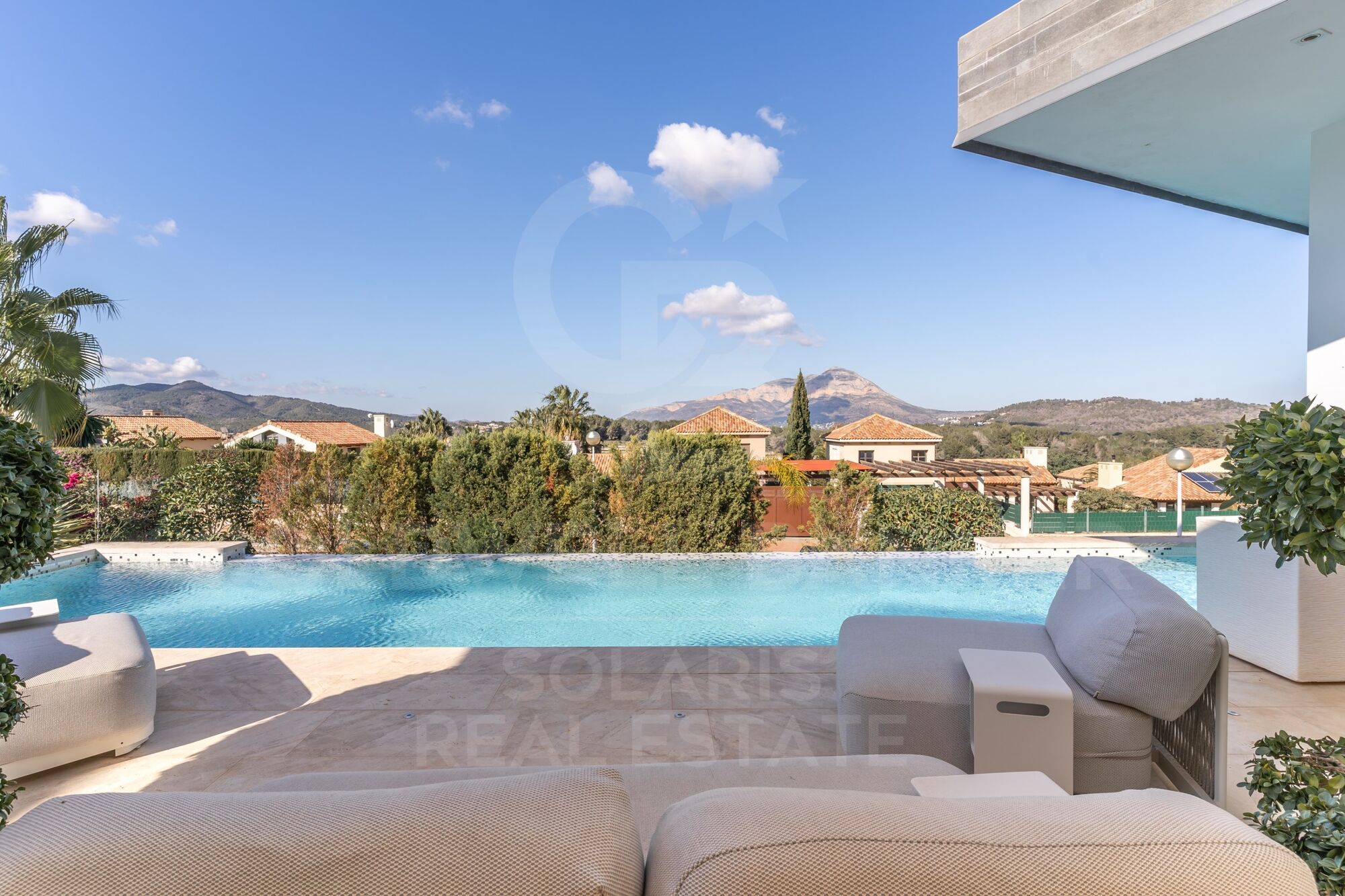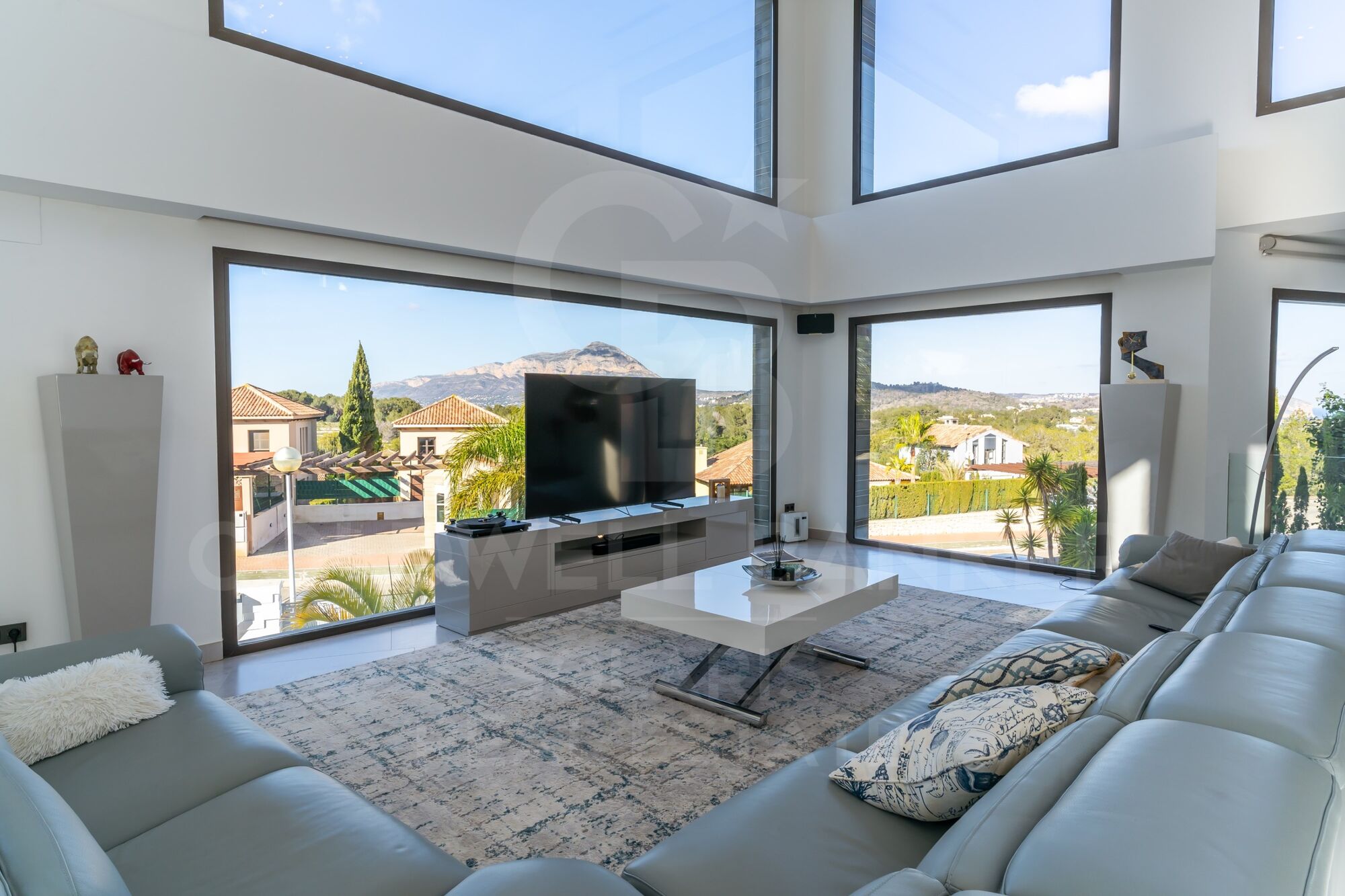 Inside, the villa features 5 luxurious en-suite bedrooms, each with its own private bathroom, designed with sophisticated details that combine comfort and style. The impressive living room, with its double height and large-format windows, floods the space with natural light and offers captivating panoramic views of the majestic Montgó, creating a unique atmosphere of connection with the surroundings.