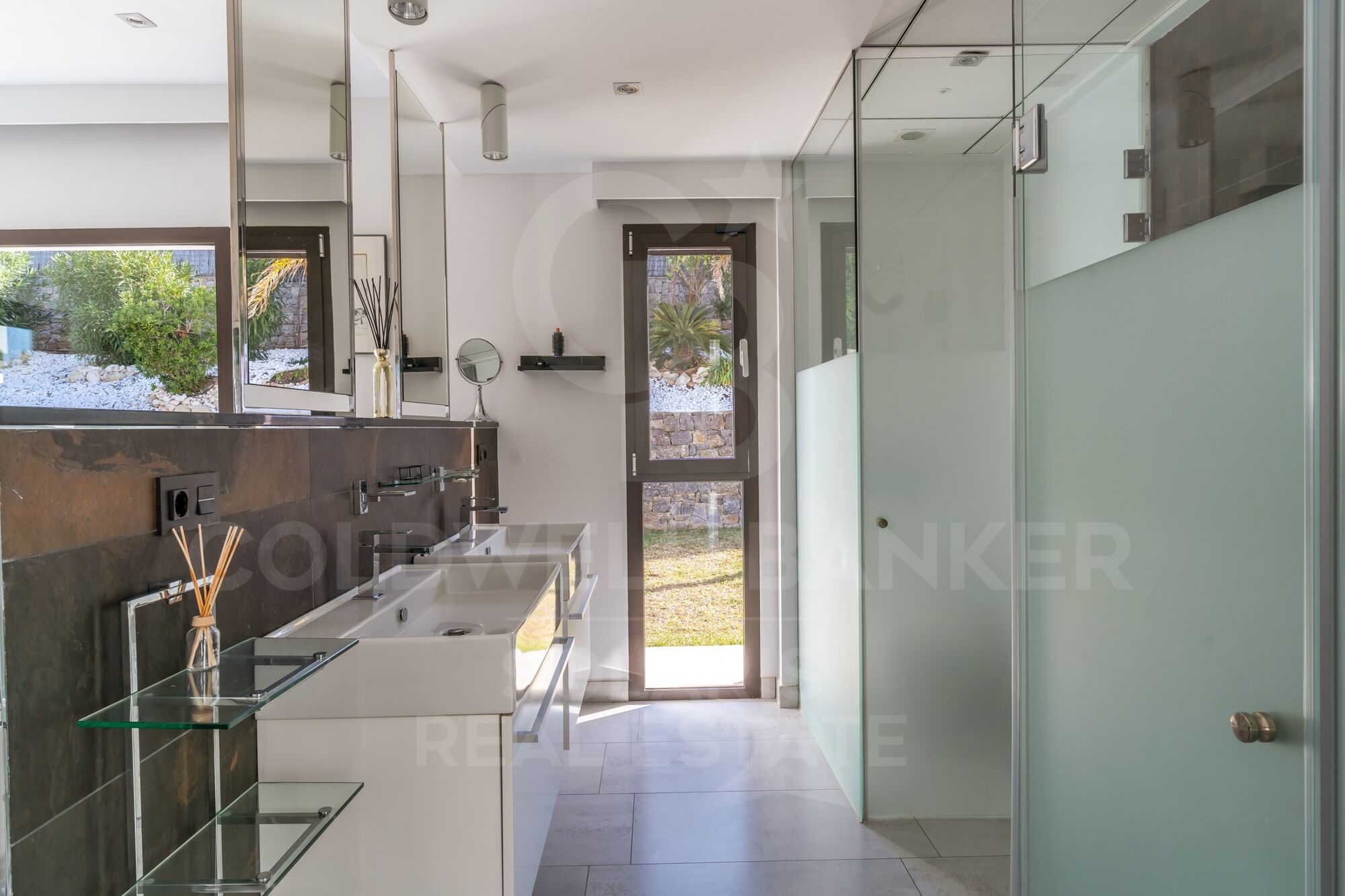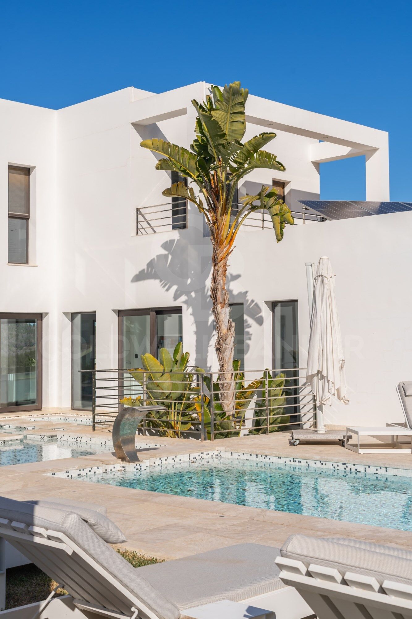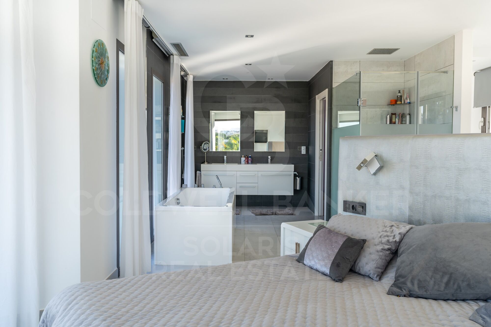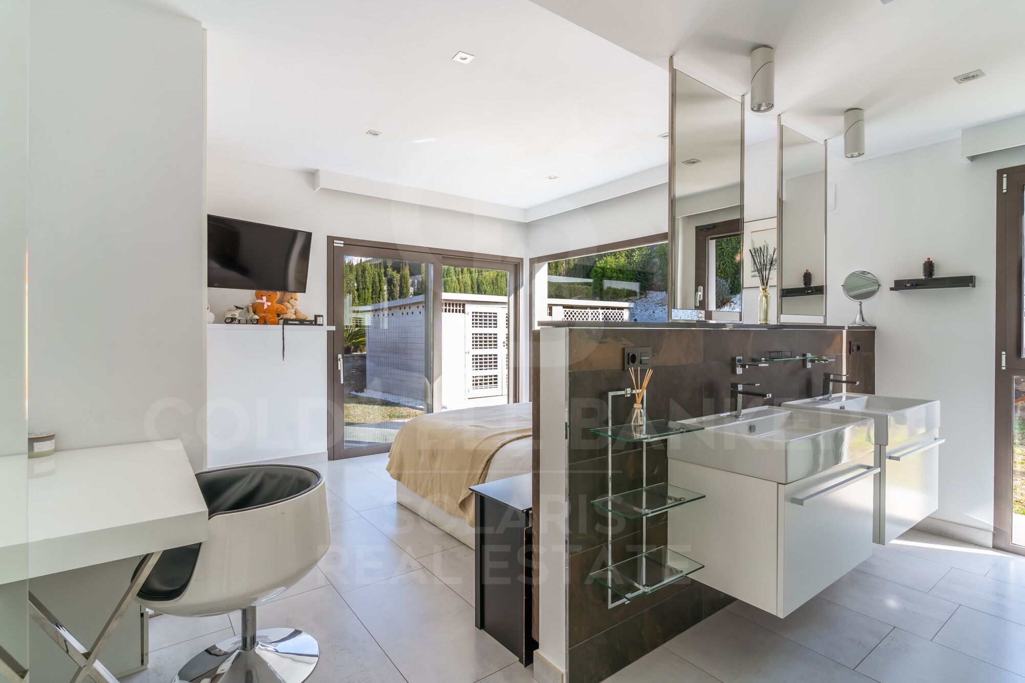 The villa also has an office on the upper level, overlooking the spectacular living room, as well as a private garage, storage room and fitted wardrobes, which maximise the functionality of the property. Its modern design and exquisite decoration make it an architectural gem, with a panoramic orientation that allows you to enjoy unobstructed views and abundant sunlight throughout the day.