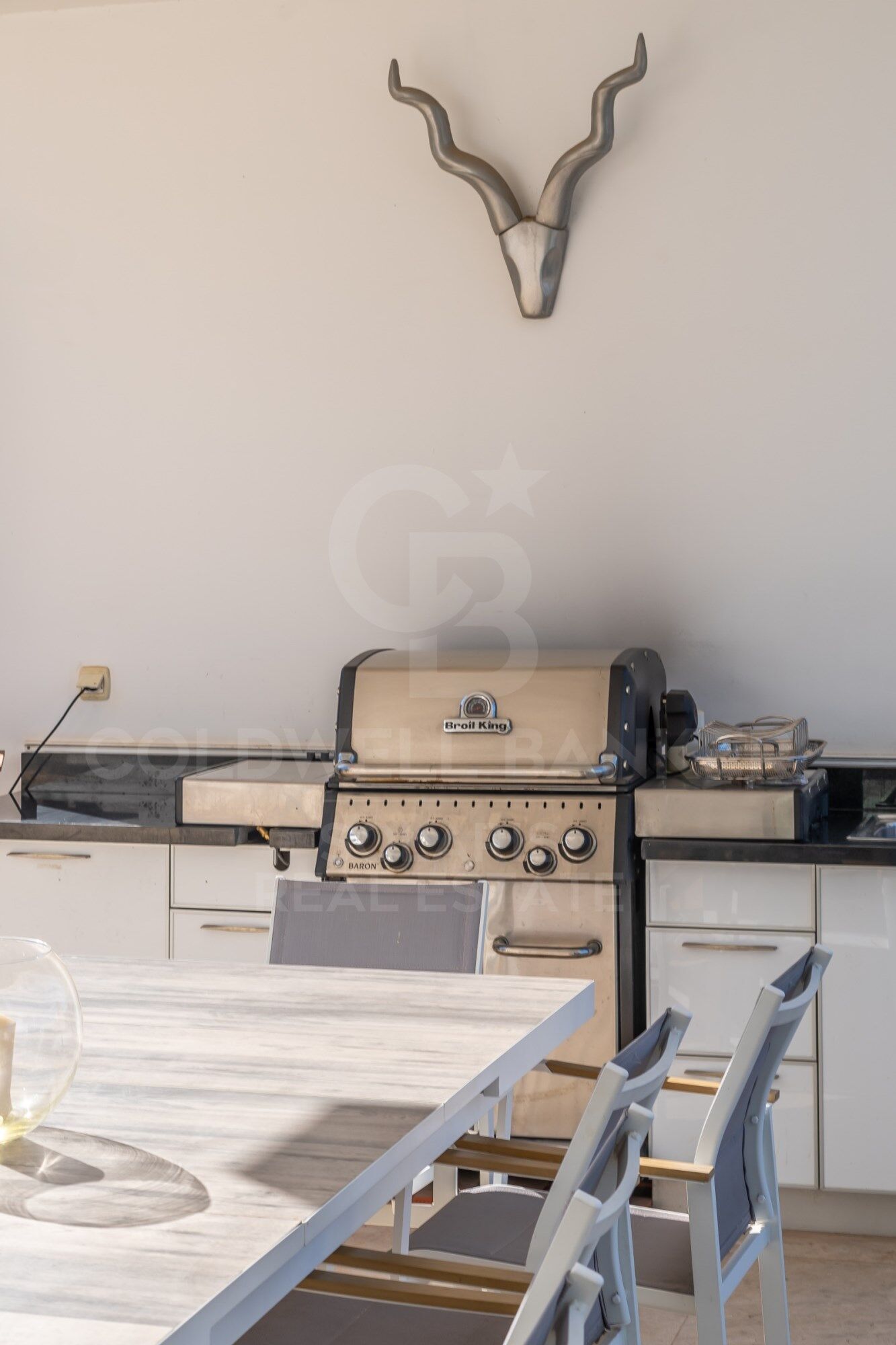 The main kitchen, equipped with state-of-the-art appliances, includes a central island that invites you to share unforgettable moments. The dining room, presided over by an elegant table for 10 people, connects fluidly with the outside, where a summer kitchen with barbecue awaits, ideal for enjoying outdoor meetings in a spectacular setting.