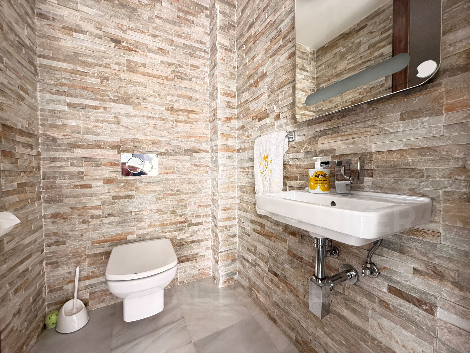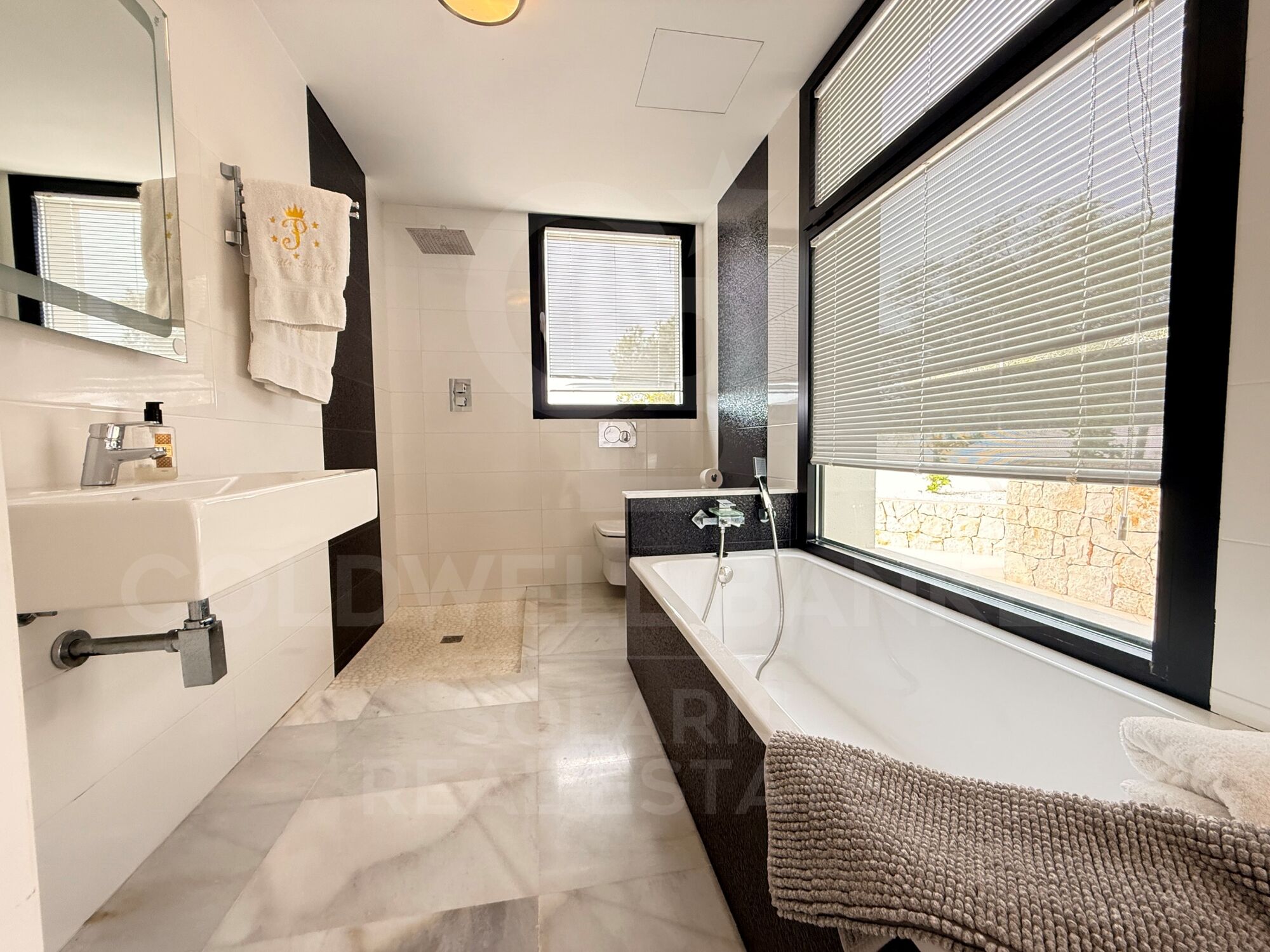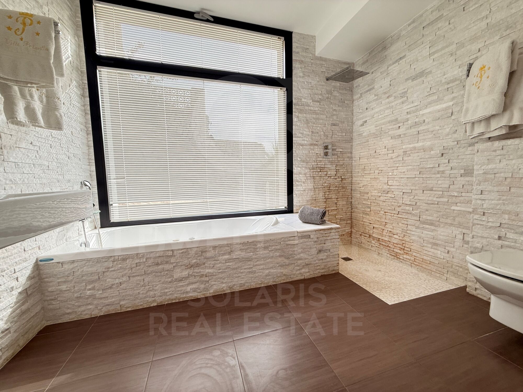 The villa has 4 double bedrooms, 3 full bathrooms with shower and bathtub, and 1 guest guest toilet.
