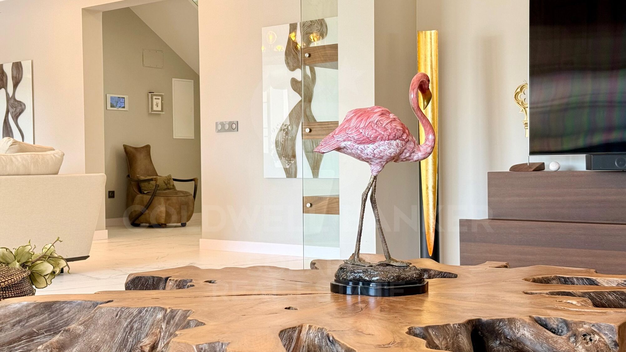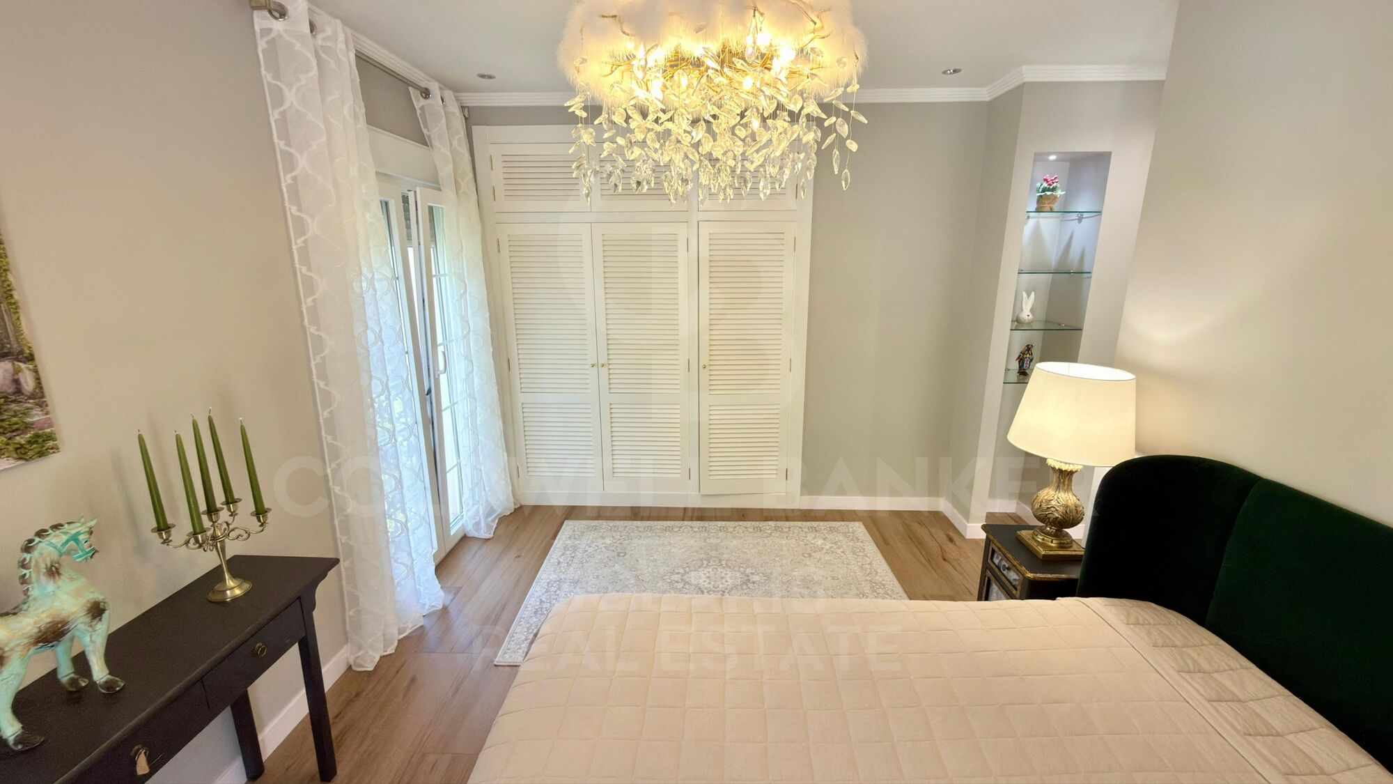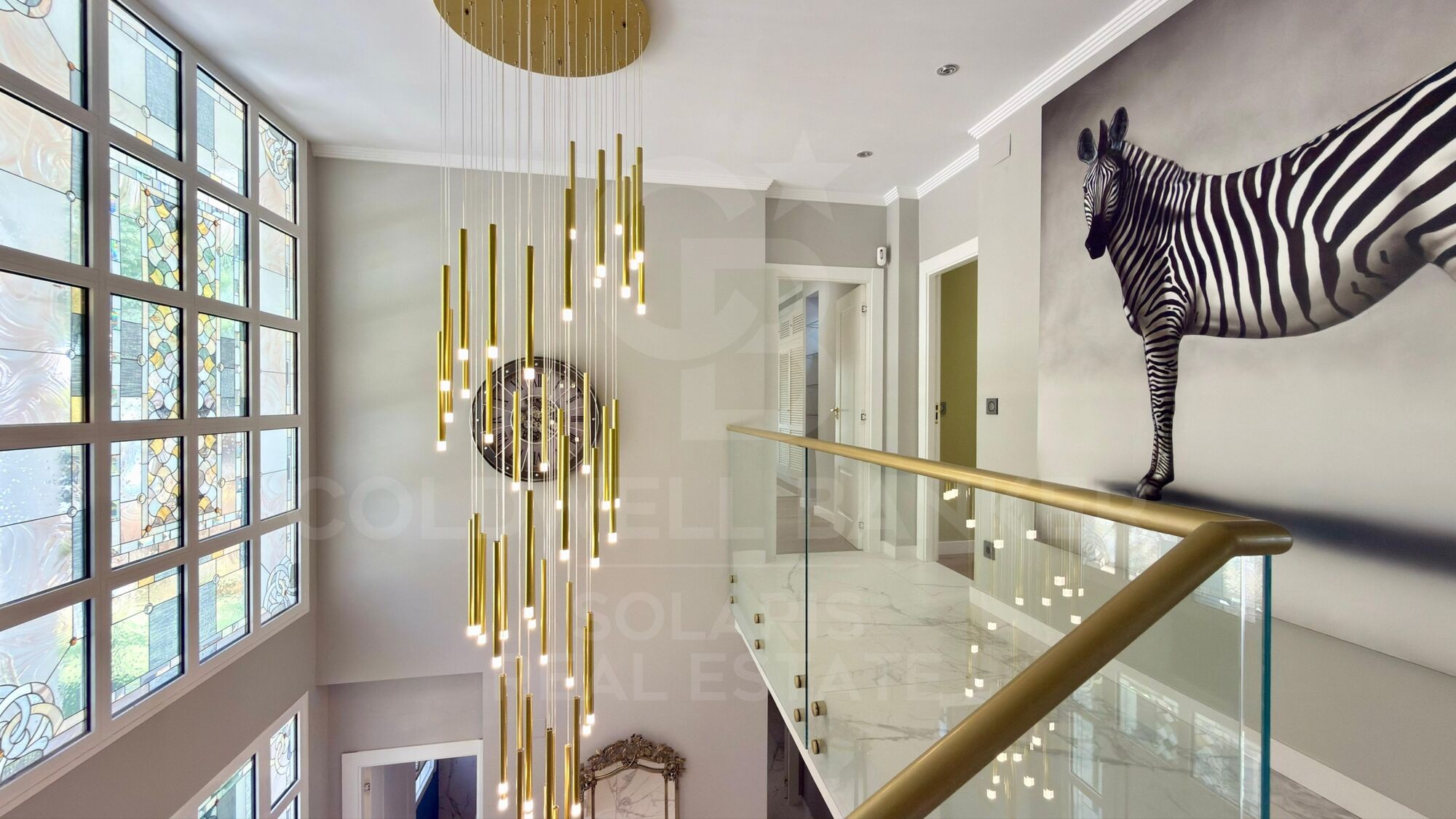 On the ground floor, a spectacular entrance hall with double-height ceilings and stained glass windows welcomes you with abundant natural light. The main living area includes a functional fireplace with hand-painted gold accents, while a second living room is designed for entertaining, equipped with an oversized TV and automatic blinds.