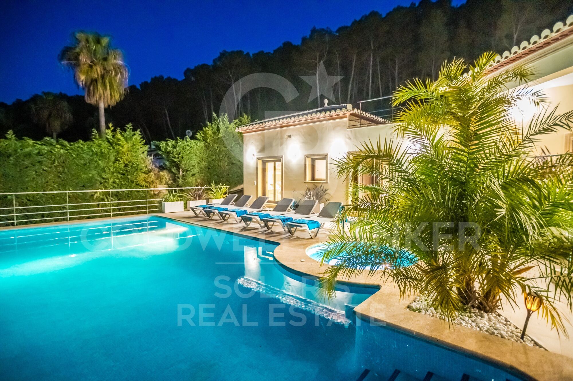 Located in the prestigious residential area of La Lluca, this stunning Mediterranean-style villa combines timeless elegance with modern comfort. Completely renovated between 2020 and 2022 with top quality materials, it offers a total living area of 485 m² (not including covered terraces and garage) on a spacious plot of 3,361 m², surrounded by tranquillity, privacy and unobstructed views. High-quality renovation The property has been completely renovated, including new windows and doors, complete electrical and plumbing installations, underfloor heating, hot/cold air conditioning and designer kitchen and bathrooms. It also has an elegant covered terrace (Naya), a double garage with automatic doors and beautiful gardens. Layout and living areas The main floor has 245 m² of living space, a double garage of 54 m² and a covered terrace of 27 m² with access to the roof terrace. A bright hall leads to a spacious living room with fireplace and direct access to the terrace. The dining room is located next to a modern kitchen with panoramic views of the valley and pool, ideal for day-to-day living and entertaining. This floor includes three double bedrooms and four bathrooms, including a master suite with dressing room and en-suite bathroom. The ground floor (240 m²) houses a separate guest flat with kitchenette, living/sleeping area and bathroom, perfect for visitors or to generate rental income. It also has a large games room or gym, a charming wine cellar, storage rooms and multipurpose spaces ideal as a study, workshop or leisure area. Outdoor Living The villa is surrounded by mature gardens with more than 40 fruit trees, spacious terraces and a 9 x 4 m swimming pool offering complete privacy. Next to the pool, there is a space prepared to build the summer kitchen of your dreams, perfect for enjoying the Mediterranean lifestyle all year round. The property also offers beautiful open views of the valley and surrounding mountains. Privileged location Located between Javea and Moraira, La Lluca is one of the oldest and safest urbanisations in the area. The villa offers excellent access to amenities, international schools, an 18-hole golf course and the best beaches on the Costa Blanca. Alicante and Valencia airports are just an hour away by motorway. #ref:CBS718N