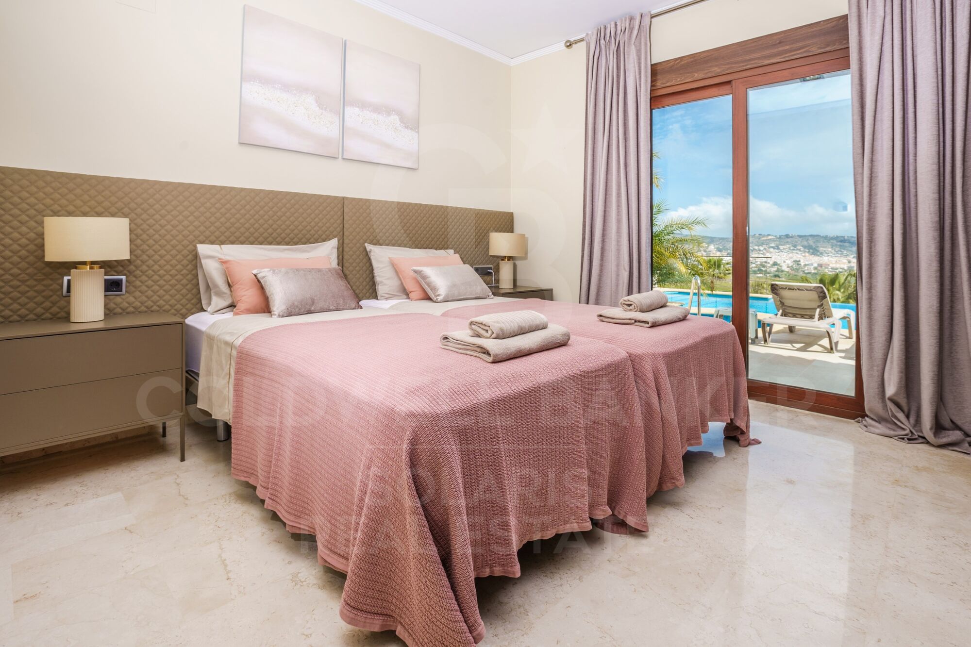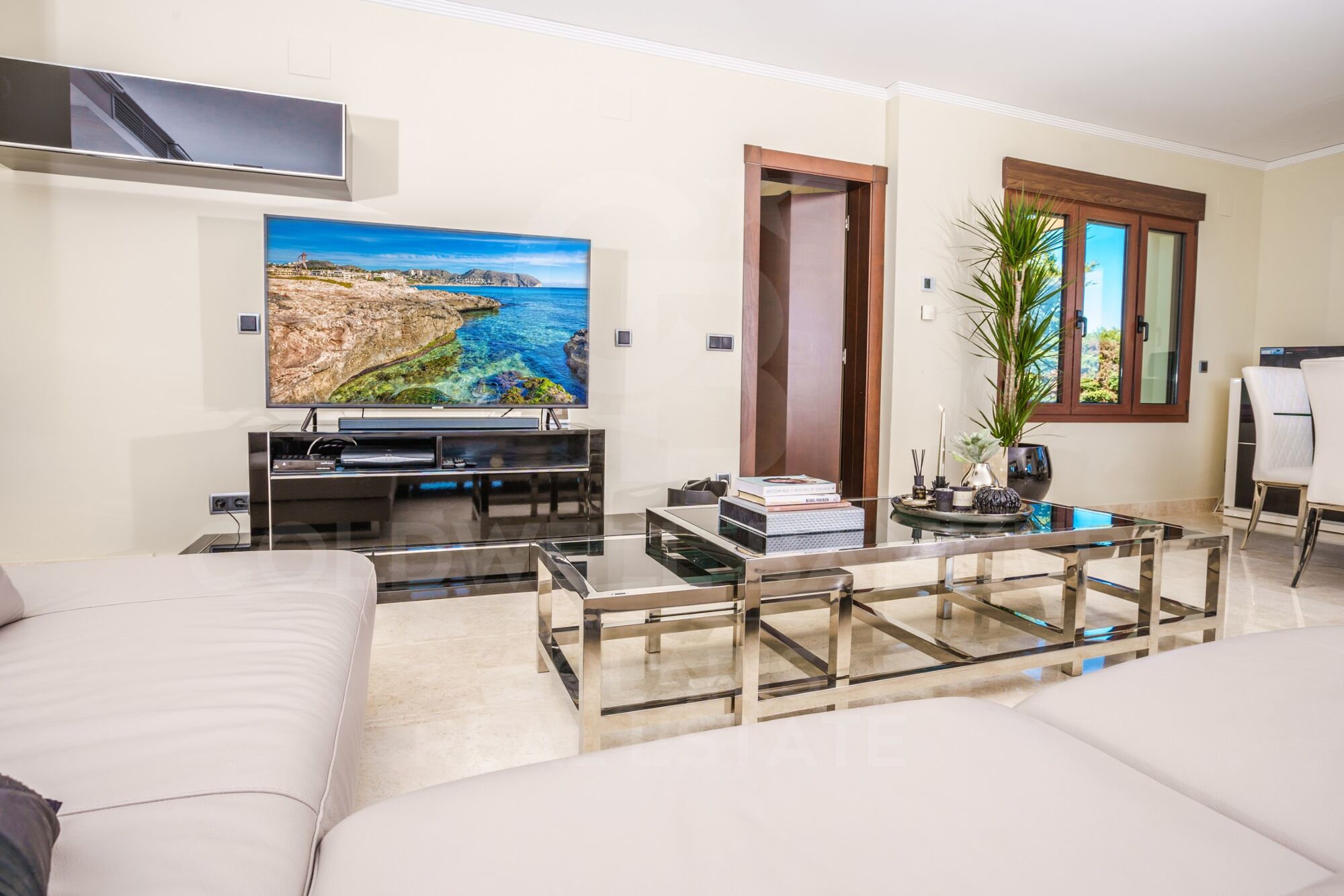 The spacious lounge/dining room is bright and comfortable with delightful views and direct access to the main terrace and pool.