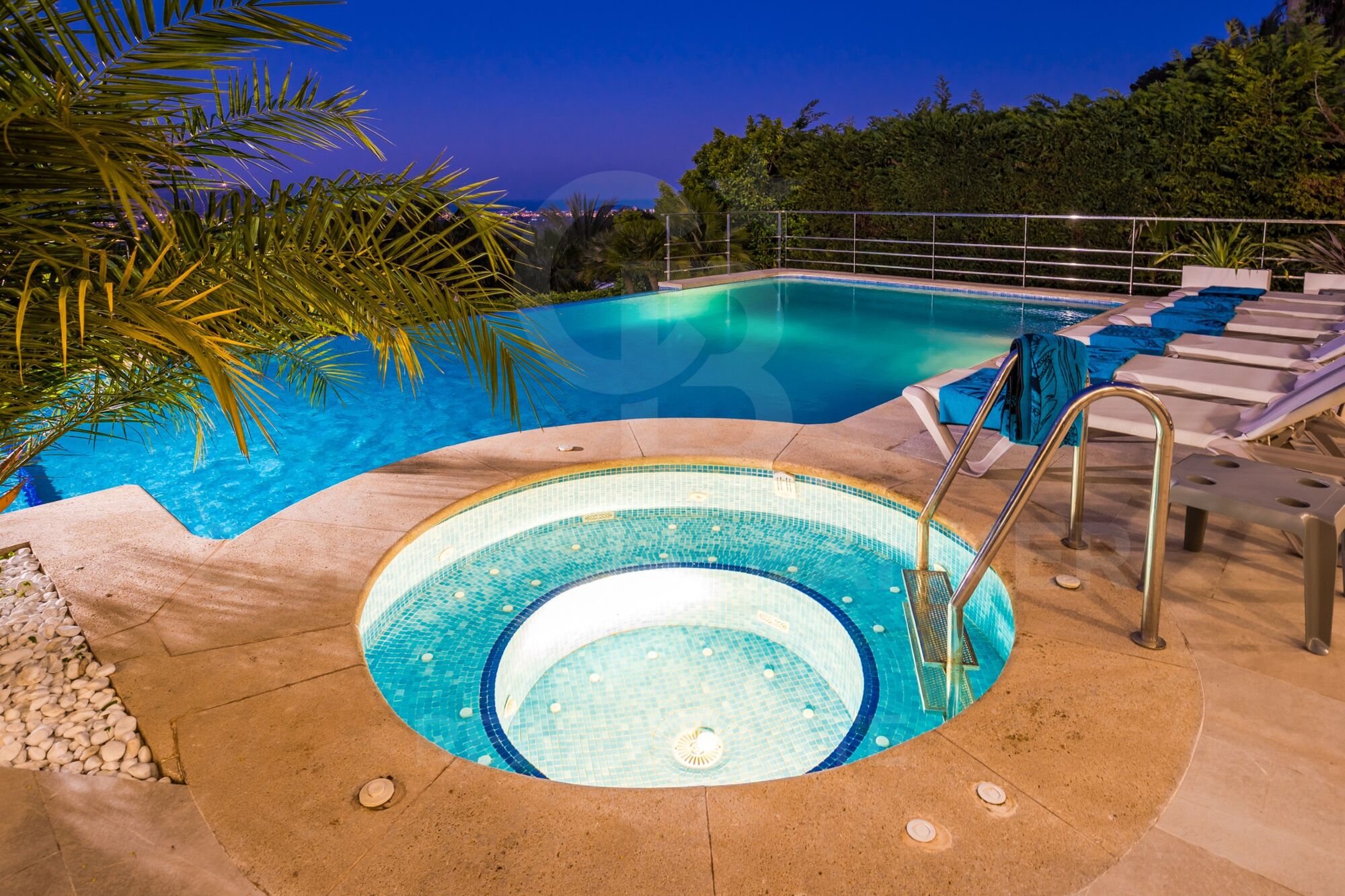 The villa offers total privacy; the 10x5m infinity pool also has a jacuzzi; the panoramic view of the bay, the sea, the valley and the mountains is incredible.