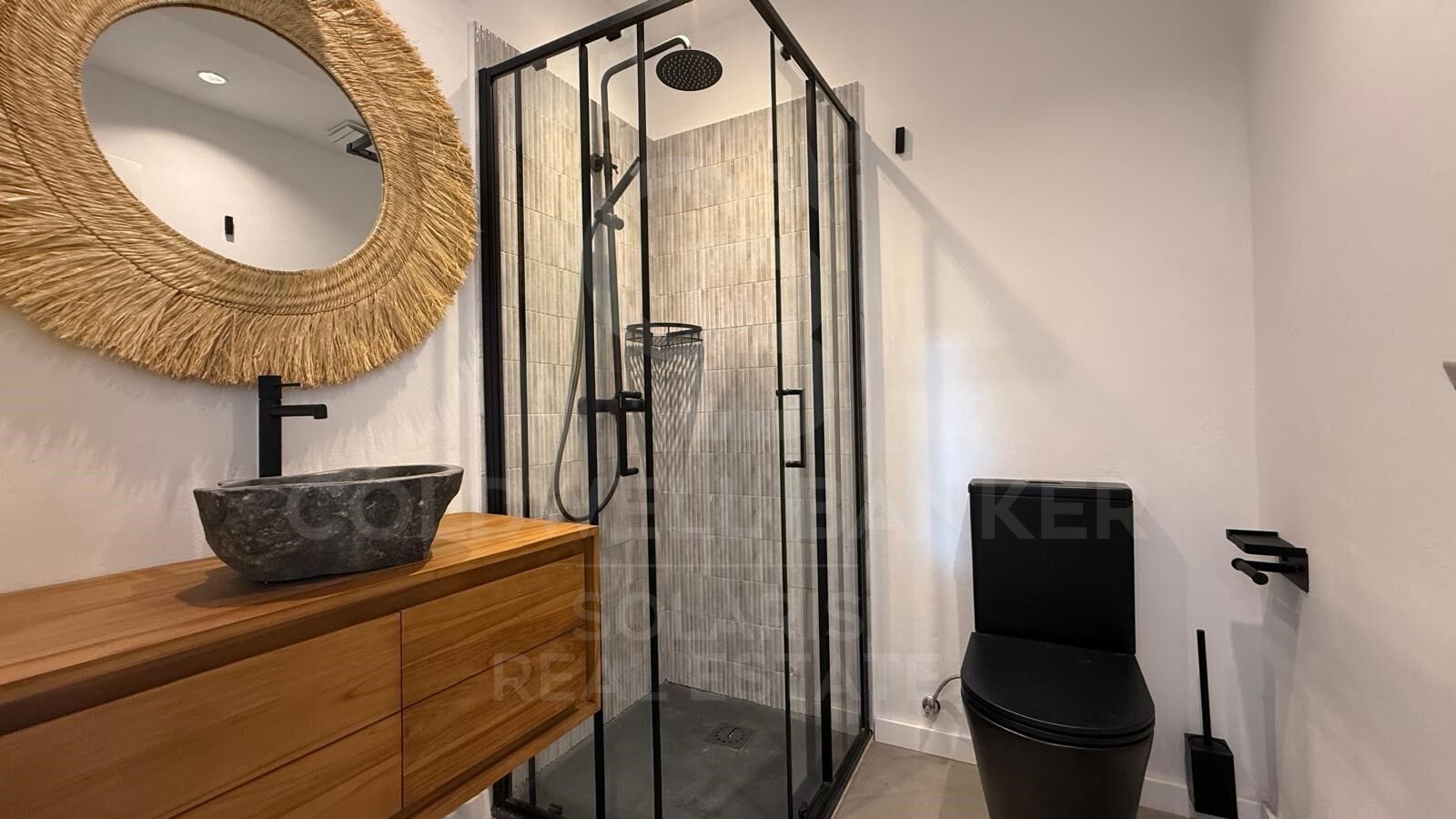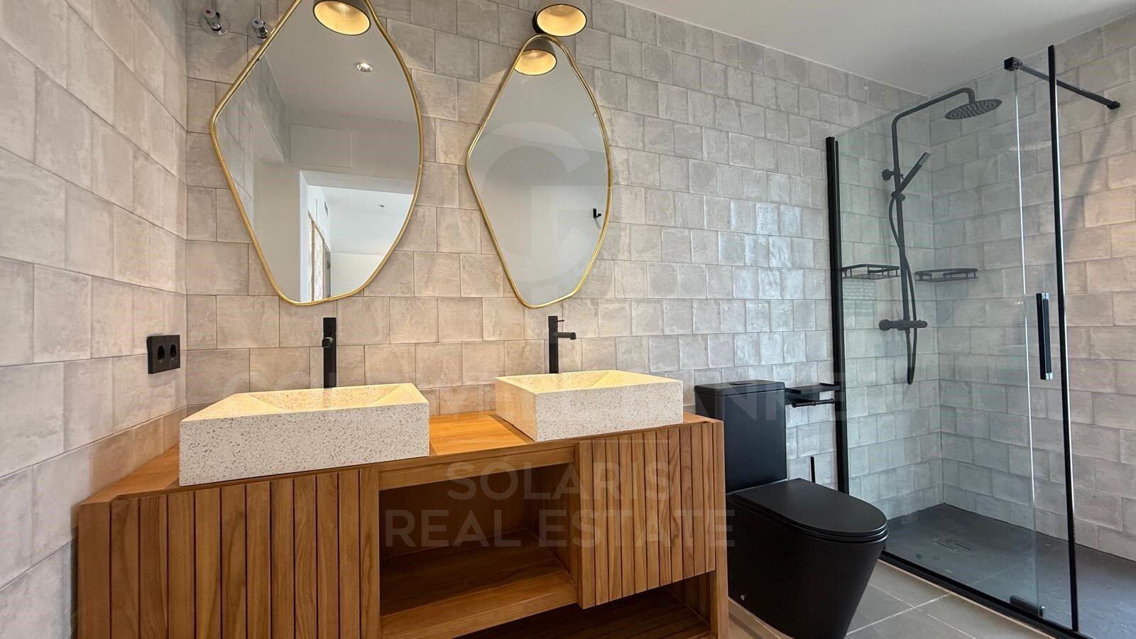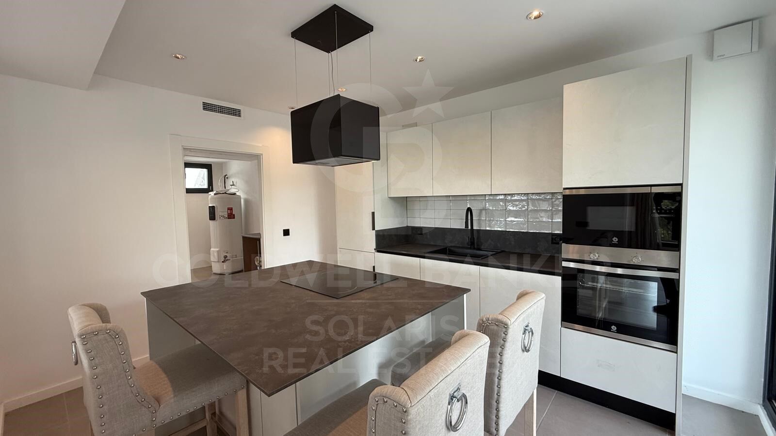 The villa has 3 spacious bedrooms, each with its own en-suite bathroom, plus a guest toilet. The kitchen is semi-American, connected to the common areas, providing a modern and cosy atmosphere. It also includes a separate laundry room for added convenience.