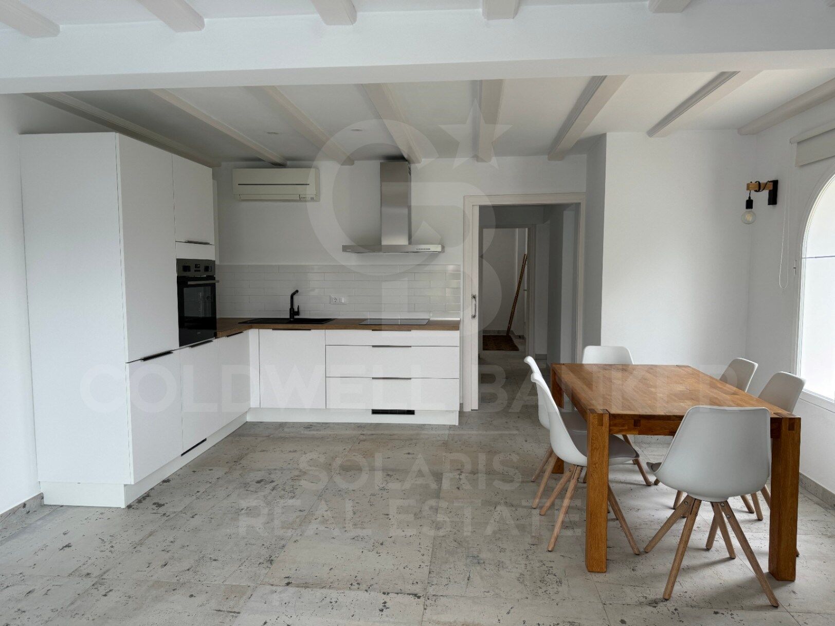 On an upper level, a cosy hall opens onto a spacious open-plan living-dining room; Both are designed to maximise natural light, creating a warm and welcoming atmosphere. The kitchen, fully equipped with high-end appliances and a generous central island, is the perfect place to enjoy moments with family and friends. The villa has air conditioning for your comfort and a wood-burning fireplace that adds a touch of warmth during the cooler months. From the kitchen, you access a charming covered terrace, ideal for contemplating the sea views. Climb the spiral staircase that will take you to the rooftop solarium, a perfect space to relax in the sun.