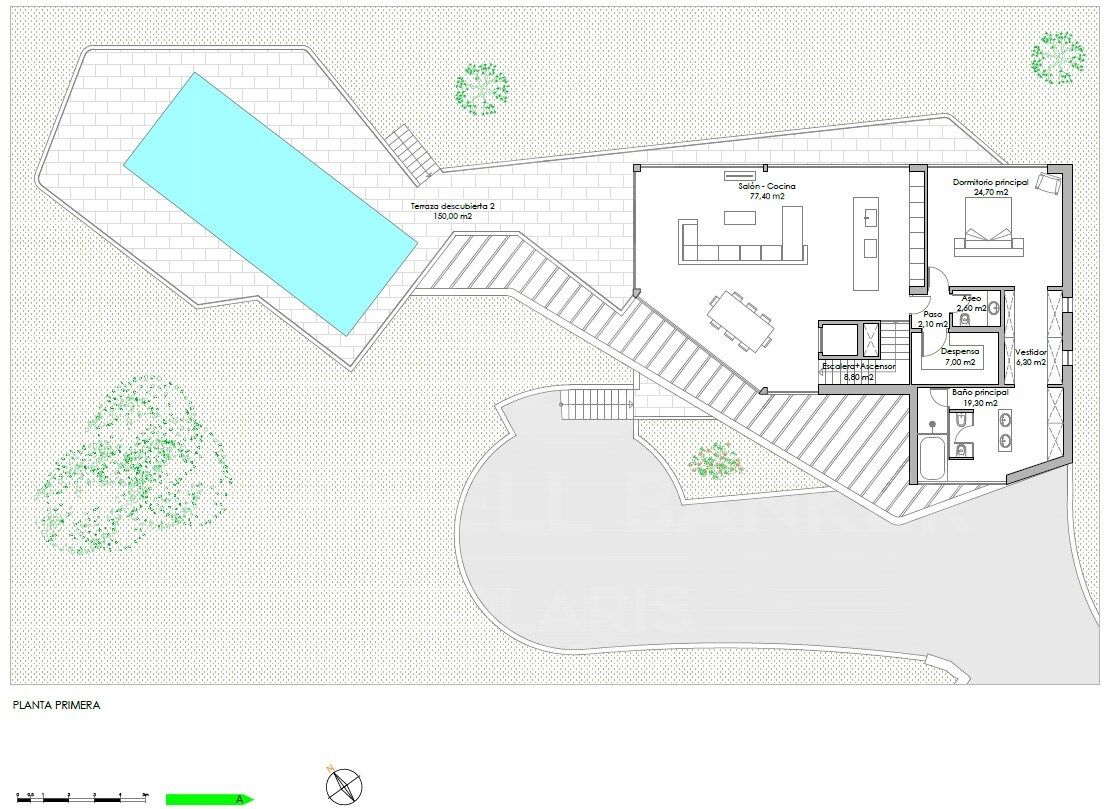 The ground floor is distinguished by a covered terrace of 36m2, accompanied by 3 cosy bedrooms and 3 luxurious bathrooms.