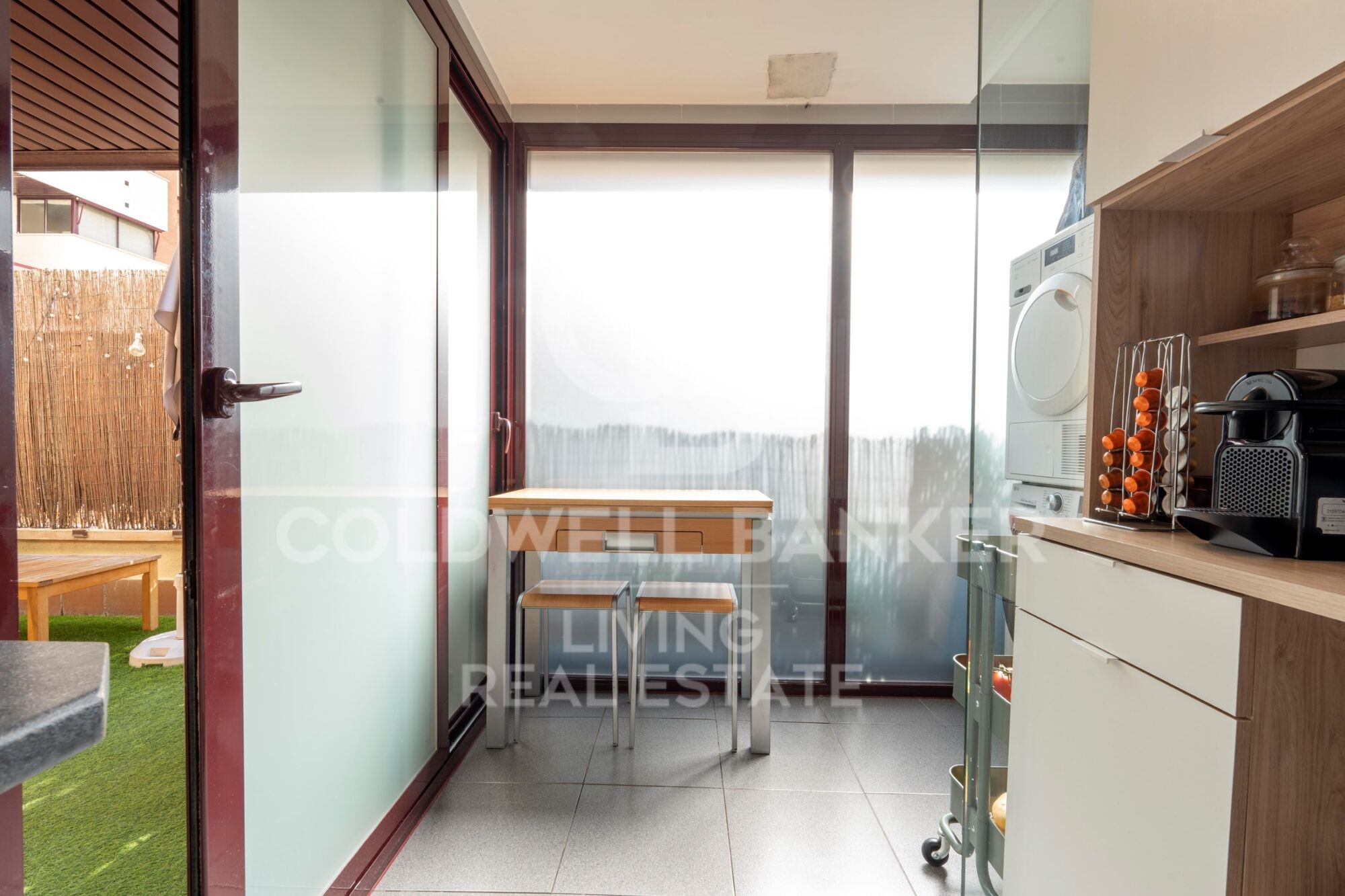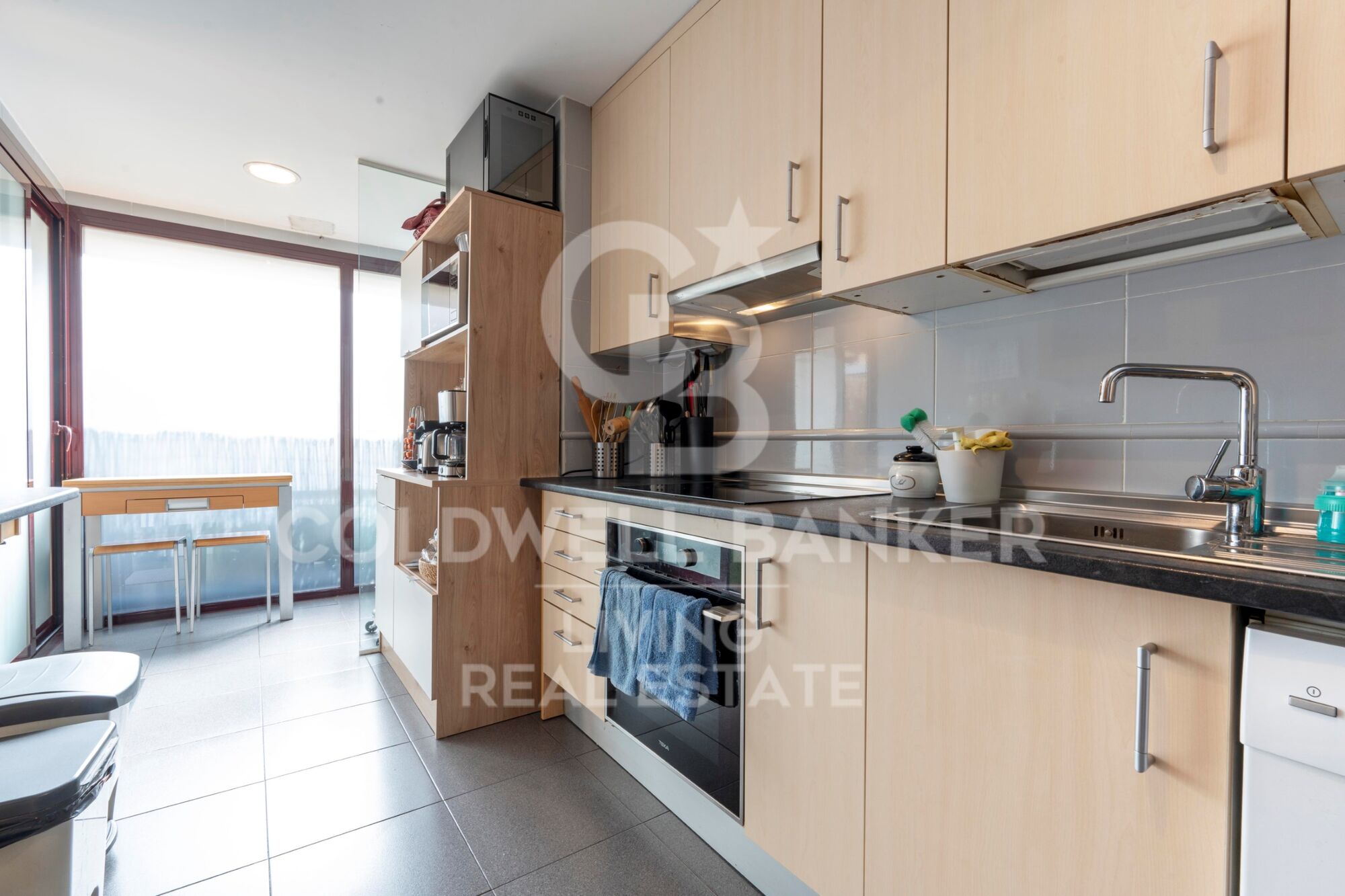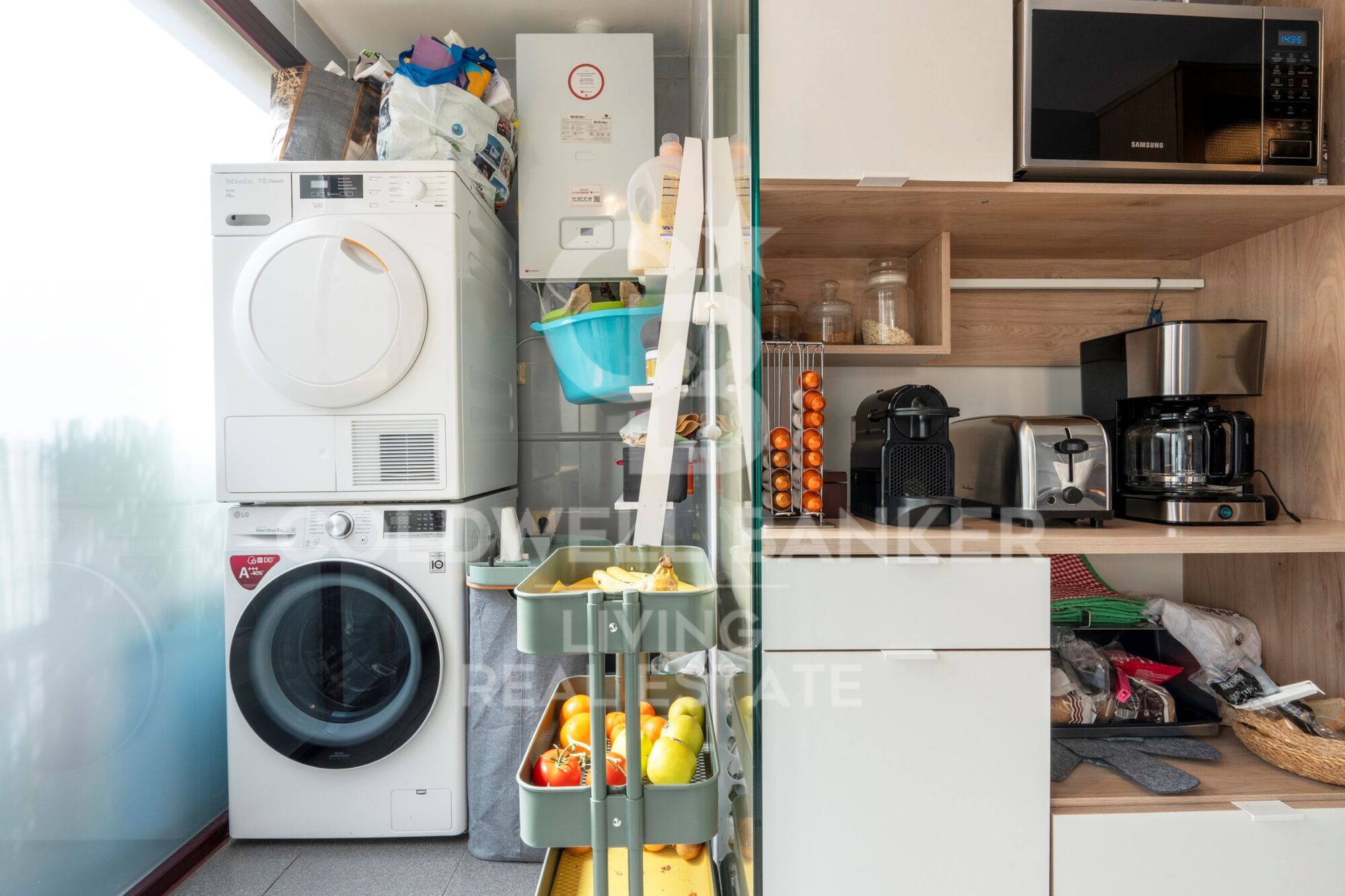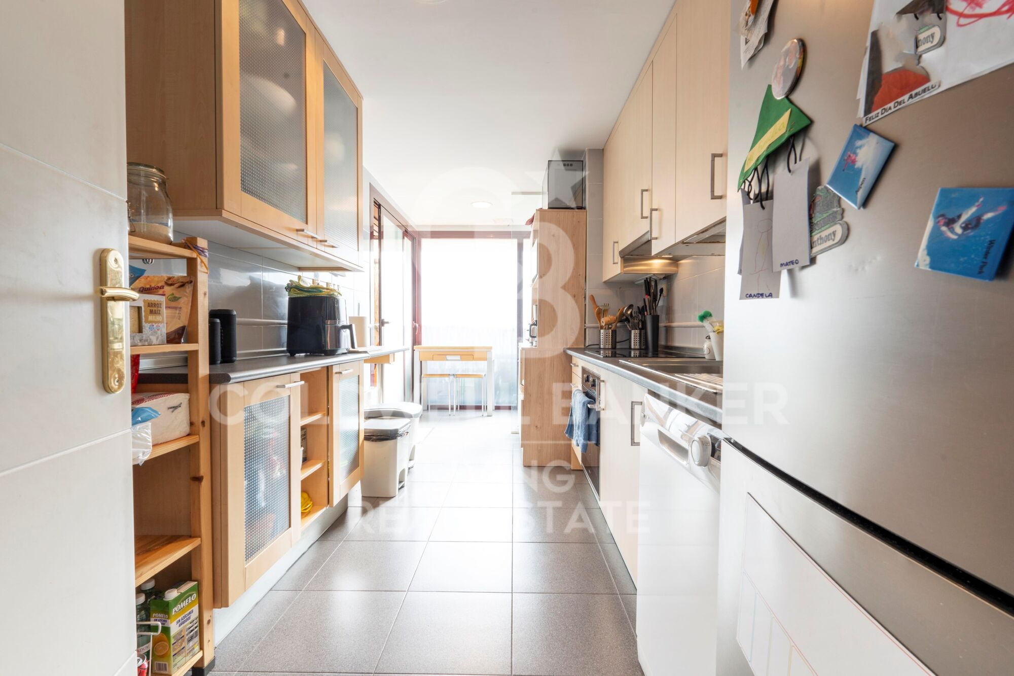 La cocina es independiente, de buen tamaño, con zona de lavandería y espacio suficiente para mesa de diario. El salón, de aproximadamente 24 m², permite una distribución cómoda un sofá grande y una mesa de comedor de hast 8 comensales.