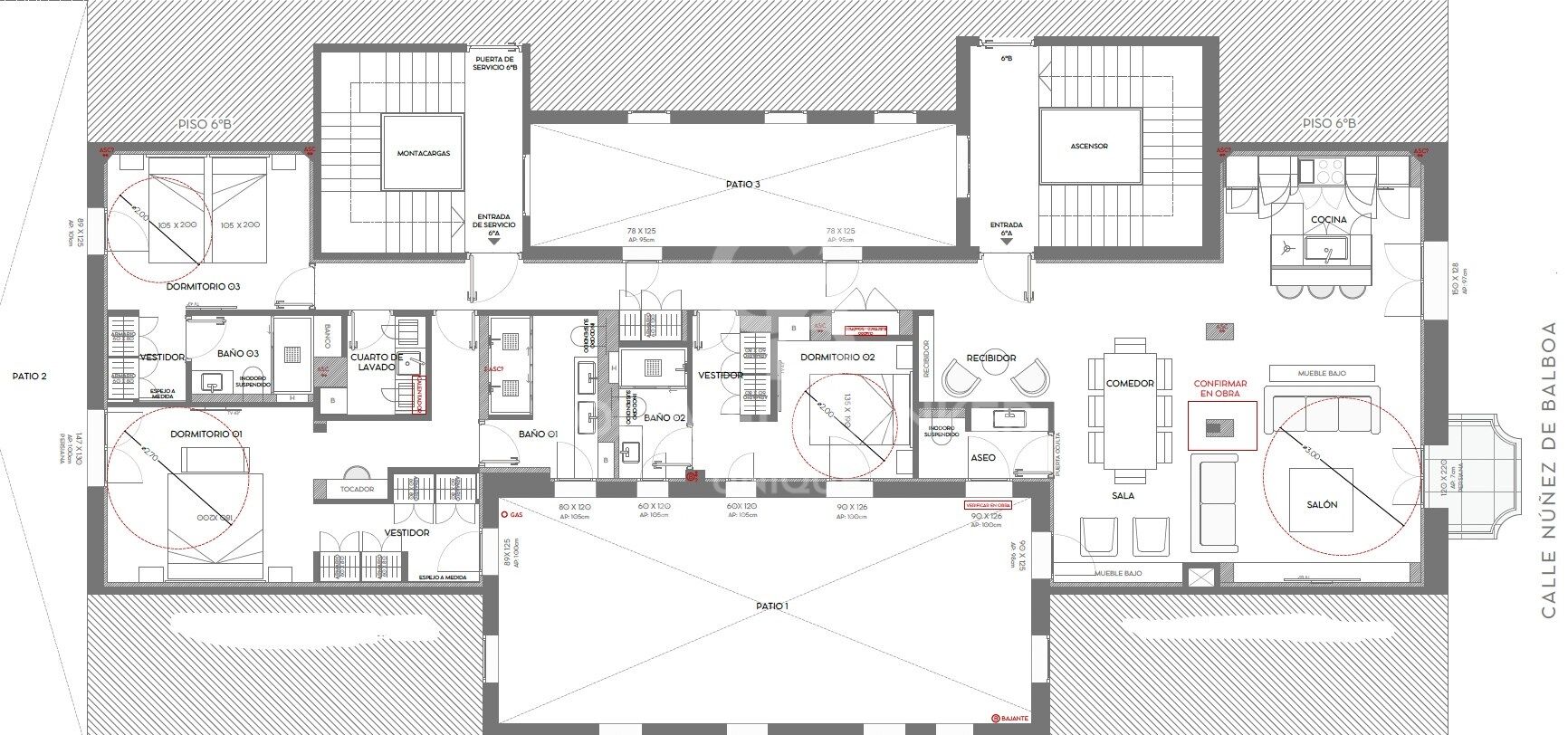 With a built area of 170 m², the property is situated on a bright sixth floor and offers a functional layout that includes three spacious bedrooms, three full bathrooms, a guest toilet, and a practical laundry room.