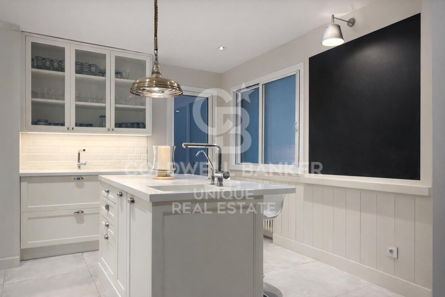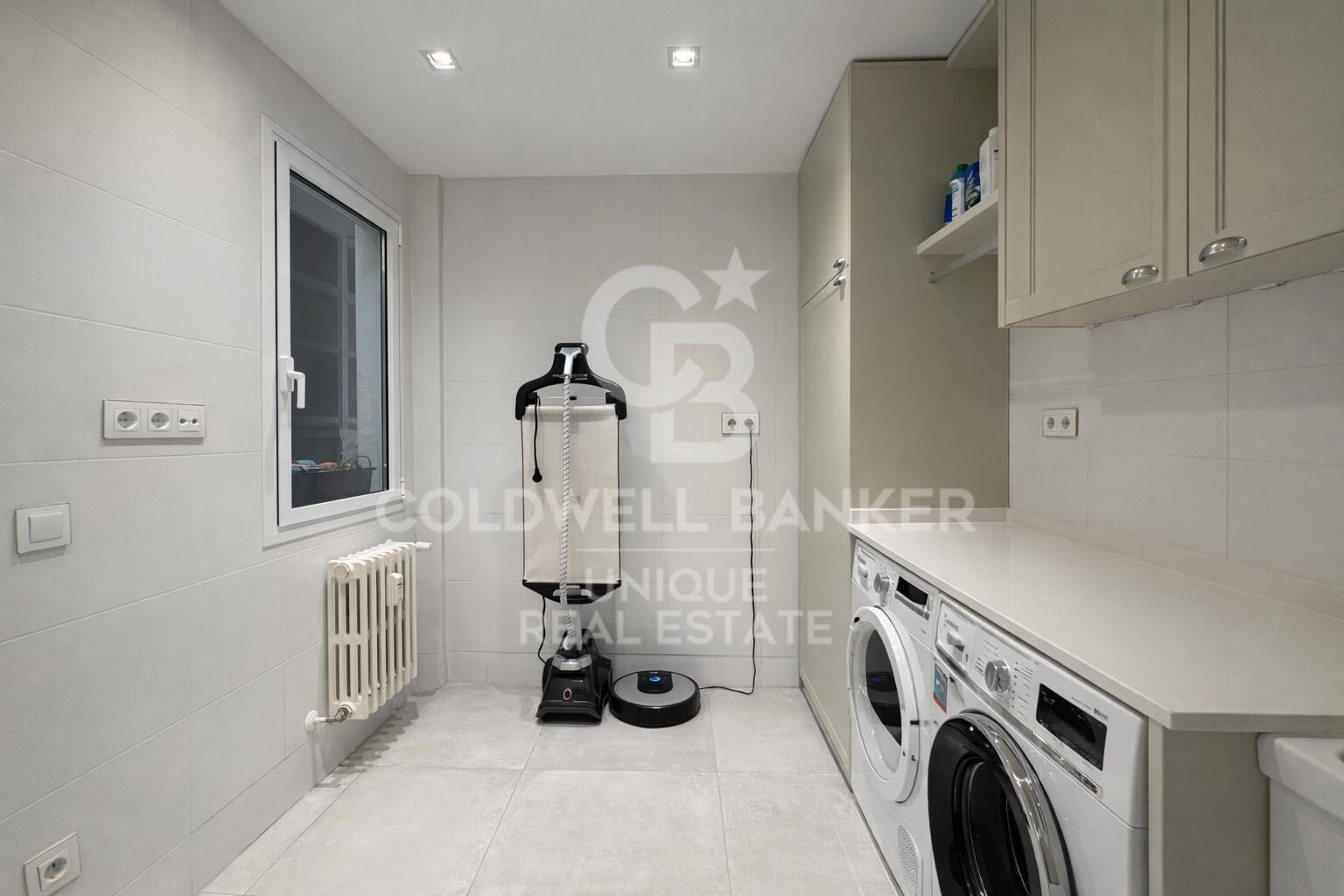 The kitchen, with a timeless style, has been designed by the prestigious firm Deulonder and is equipped with high-end materials and appliances. The property also has a separate laundry room and a comfortable service area.
