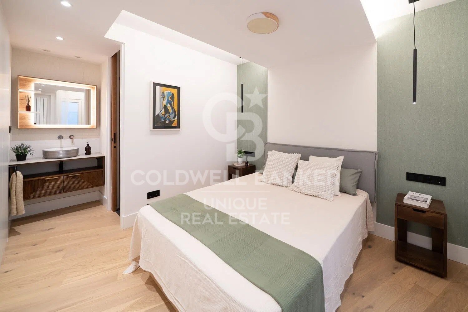 The property is located in a very well preserved building. It is an exterior flat, completely renovated with the highest standards of quality and design. The layout consists of a spacious living room located in front of a historic building, two bedrooms and two bathrooms, one of which is en suite, as well as a living area. The open kitchen is fully furnished and also has a laundry area.