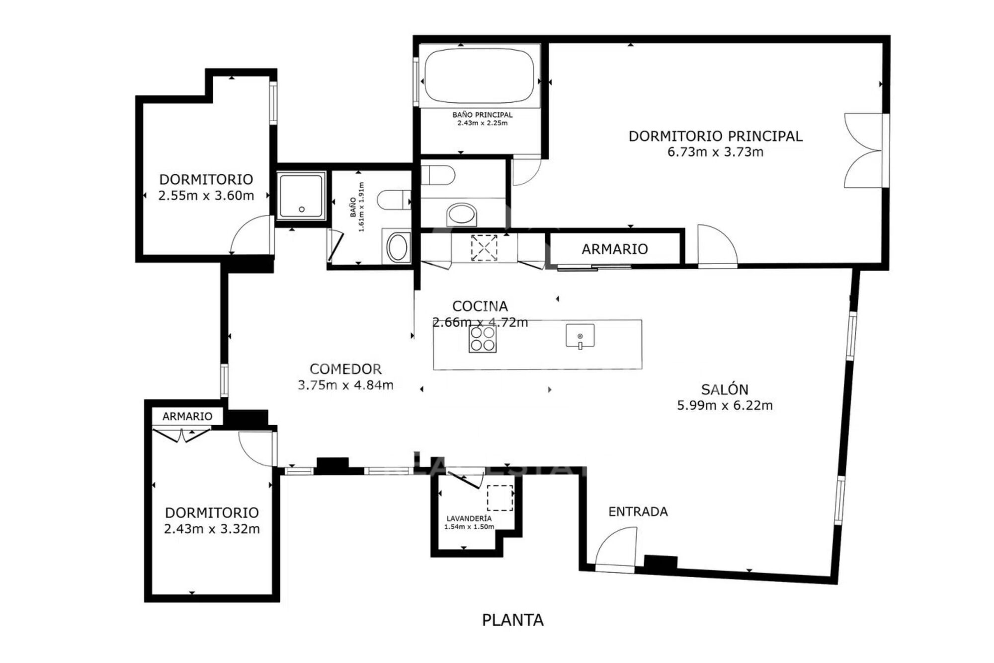 The layout comprises a spacious living-dining room, a master bedroom with walk-in closet and en-suite bathroom, two additional bedrooms sharing a bathroom, a separate kitchen and a laundry room, making it an ideal home for those seeking space, location and quality in the center of Madrid.