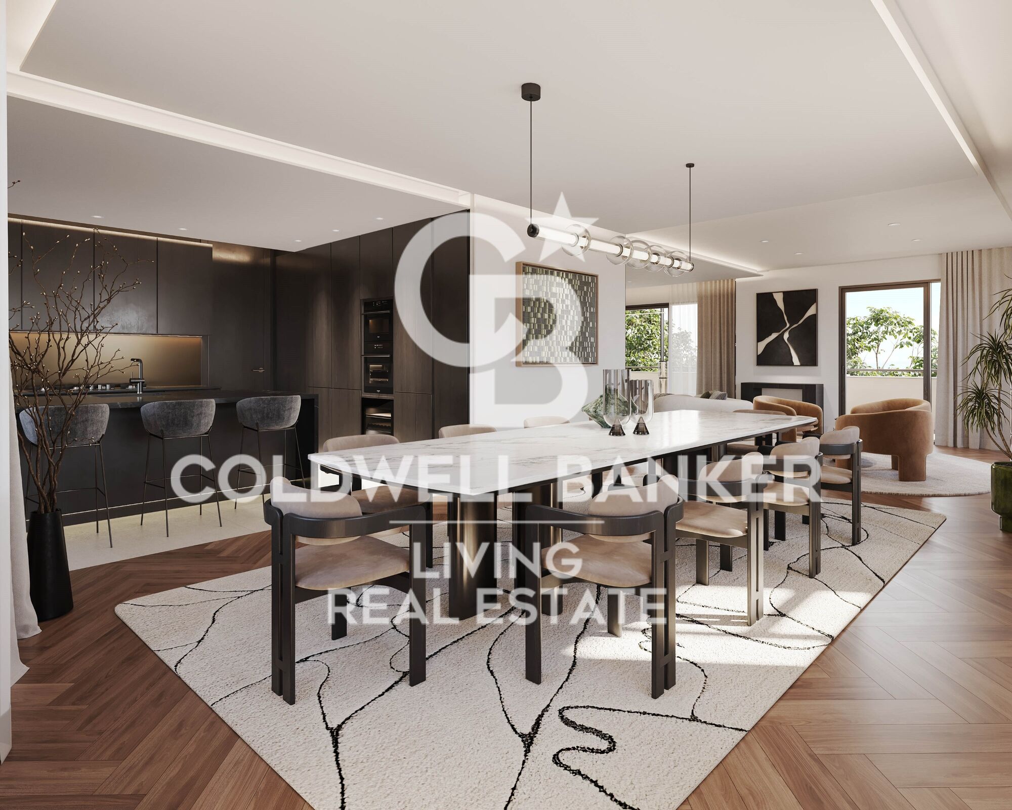 Materiales premium: suelos de nogal, gres porcelánico de gran formato, carpintería de alta gama