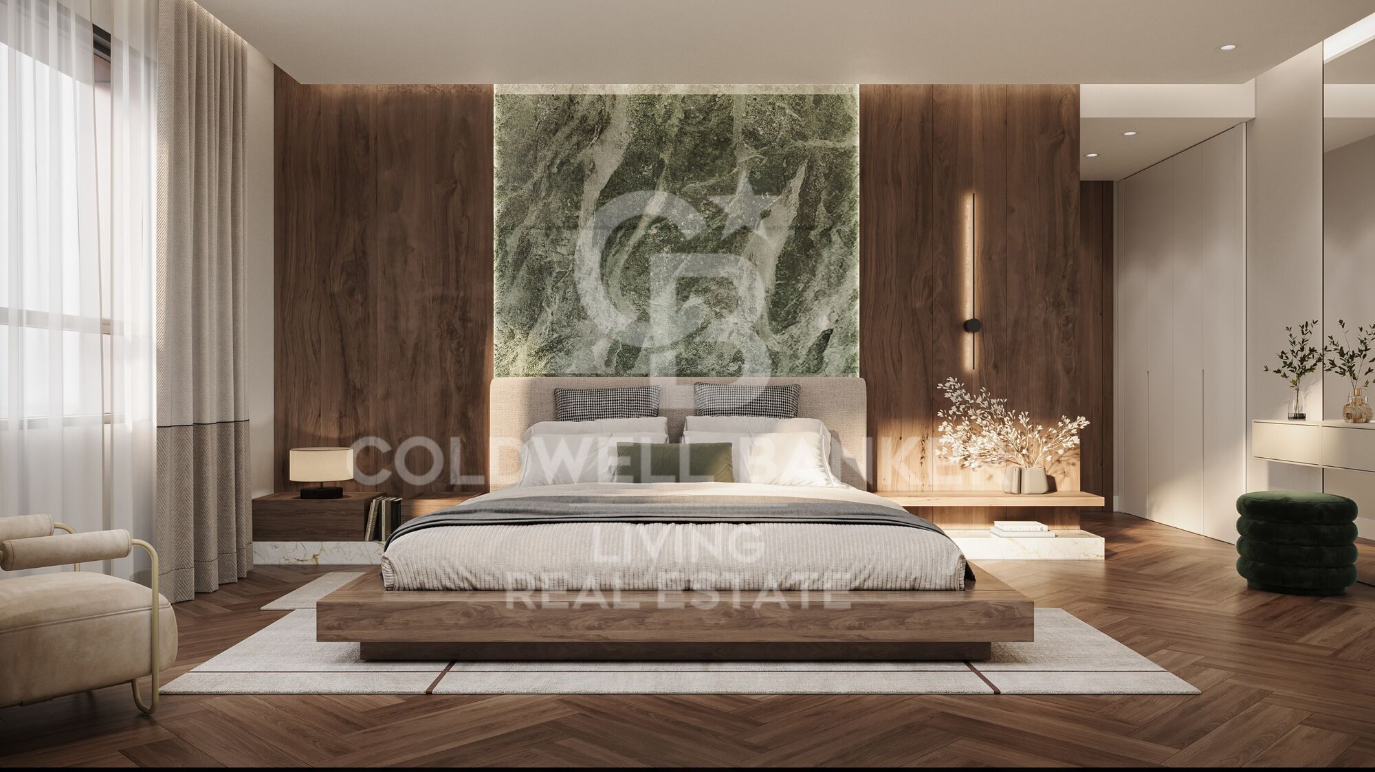 Materiales premium: suelos de nogal, gres porcelánico de gran formato, carpintería de alta gama