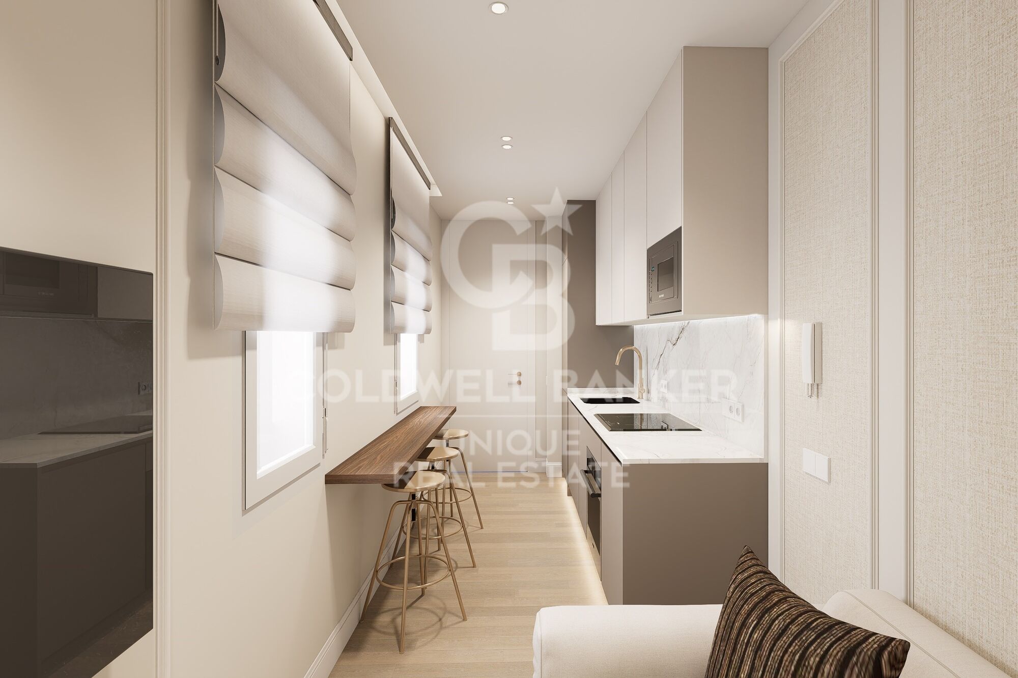The main space integrates a fully equipped open kitchen with a living room with modern and functional lines, ideal for enjoying a contemporary atmosphere. It has individual gas heating, air conditioning and is delivered furnished, which allows you to move in from day one in total comfort.