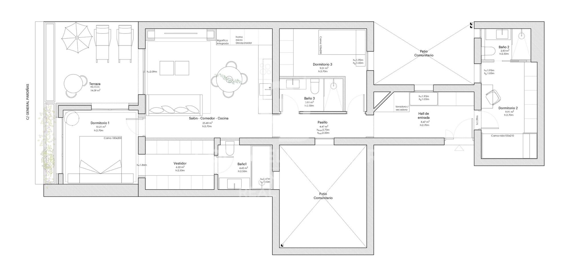 The living room offers unobstructed views and spectacular Madrid sunsets, while the spacious 17m² terrace invites you to relax and enjoy the privileged surroundings.