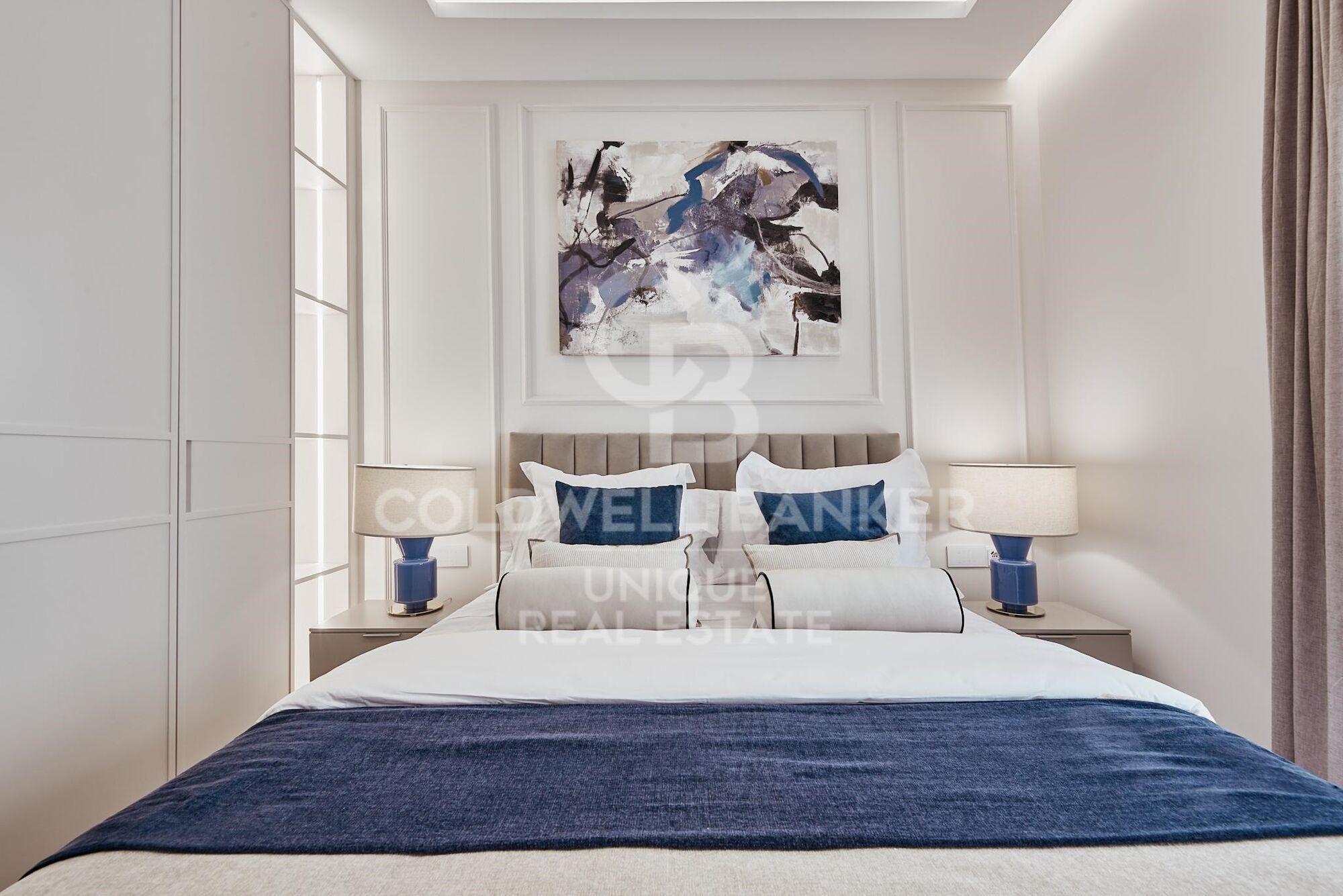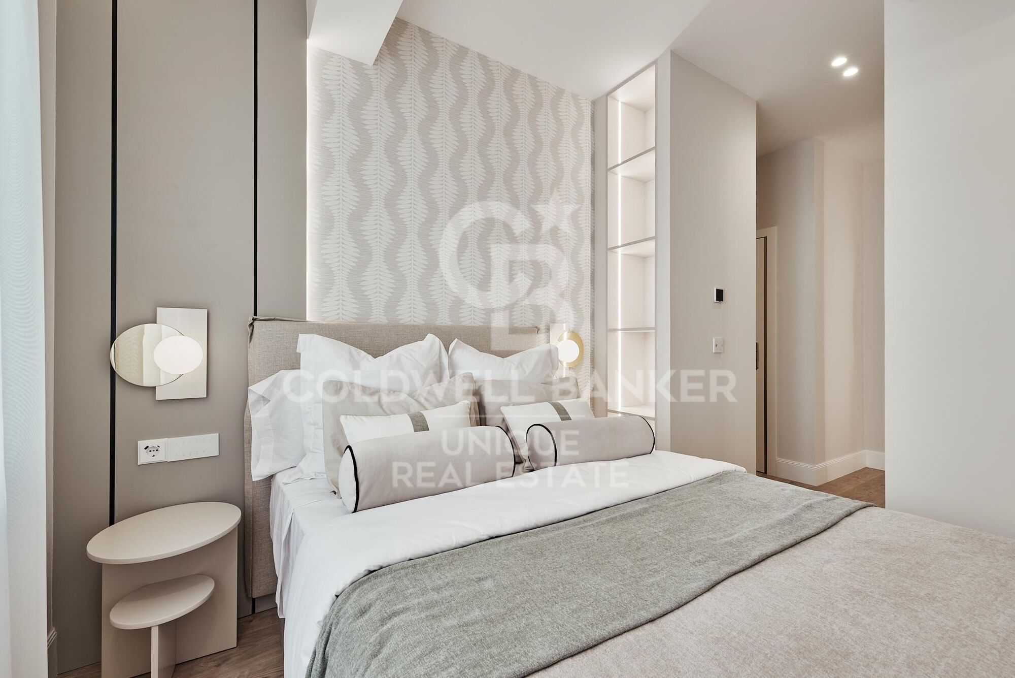 Coldwell Banker Unique presents a fully renovated home, ready to move into, that combines contemporary design with the character of a classic property in Barrio Salamanca. The apartment has been completely rebuilt to create an open and modern layout, with ceilings of 2.90 meters, cross ventilation, and a carefully planned distribution that minimizes corridors, something very rare in this area. The result is a turnkey home that radiates spaciousness, elegance, and comfort. The large oak-paneled kitchen is the heart of the property, featuring a spectacular central island, bar area, breakfast corner, wine cellar, and pantry, complemented by a semi-independent living room that invites both social gatherings and relaxation. The master bedroom includes a custom-made walk-in closet and an en-suite bathroom with double sink, while the secondary bedroom, also en-suite, boasts a large wall of wardrobes. A guest toilet and entrance hall complete the layout. The decoration follows the Japandi style, a warm minimalism that blends Japanese and Danish aesthetics, with floor-to-ceiling doors, wabi-sabi finishes, furniture from Cassina, Gubi, and New Works, lighting by Santa & Cole and Lyfa, and top-quality finishes: minimalist Cortizo windows, continuous Marazzi Versalles flooring, designer bathrooms with Marazzi ceramics, Hansgrohe faucets, stone sinks, and suspended toilets. Additionally, the property features central heating with individual meters, ducted air conditioning, custom oak wardrobes, perimeter lighting, Corston hardware, and Bosch appliances. The building offers two main elevators plus a service elevator, a stately entrance hall with a doorman, and a storage room with direct elevator access. A unique opportunity in the heart of Barrio Salamanca. #ref:CBUQ1054