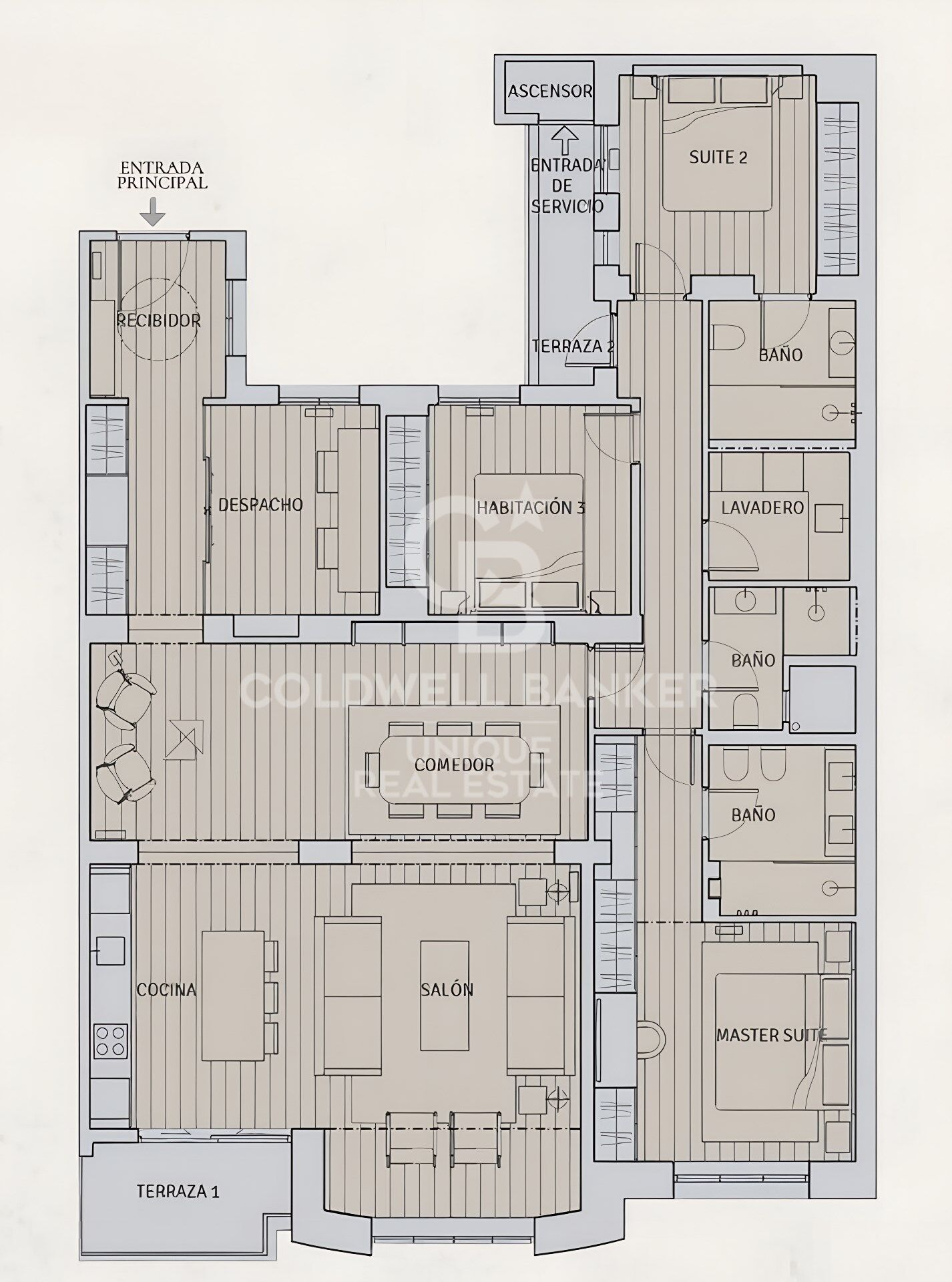 It has three large bedrooms and three full bathrooms. Two of the bedrooms have an en-suite bathroom, and one of them is currently fitted out as an office, which brings versatility to the space and allows it to be adapted to the needs of each family. The master suite offers a careful layout with a private bathroom and direct access to the terrace, generating an intimate and relaxed atmosphere.