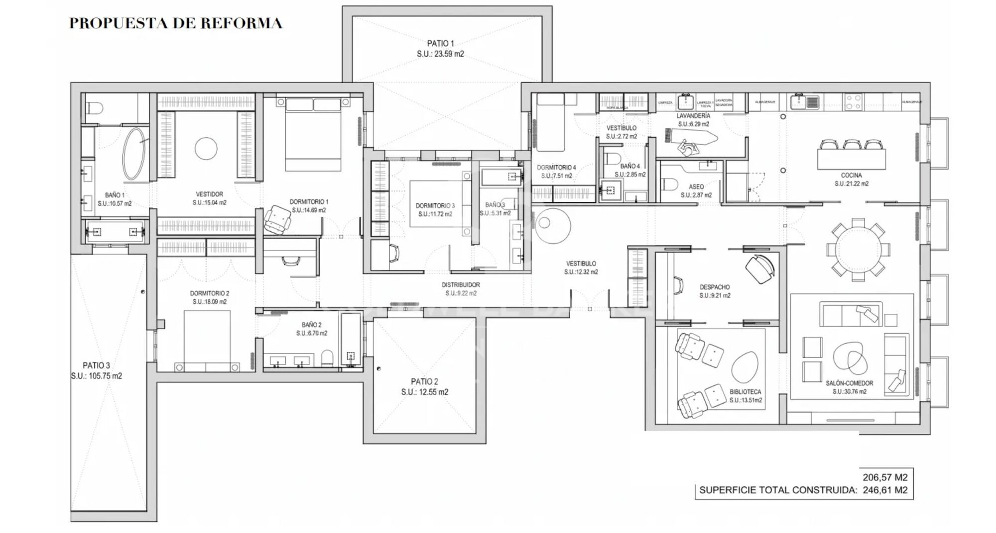 The spacious living room and social areas stand out for their extraordinary natural clarity and for their four balconies overlooking the street, which enhance the feeling of openness and connection with the environment. A guest toilet completes the layout, designed to offer comfort and practicality on a day-to-day basis.