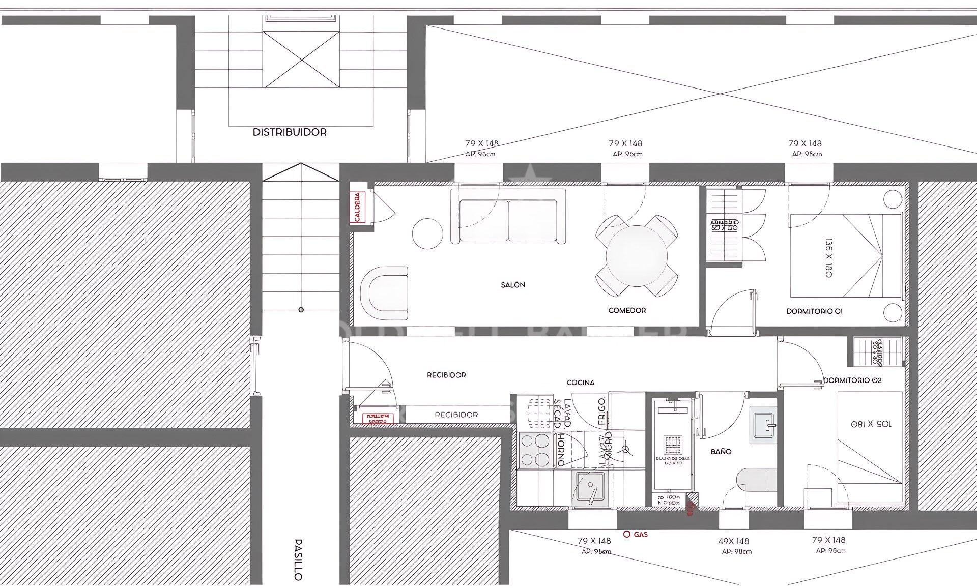 The architectural intervention redefines the space to offer a compact, elegant and perfectly laid-out home, featuring a living-dining room with an integrated fully equipped kitchen, two bedrooms and a complete bathroom.
