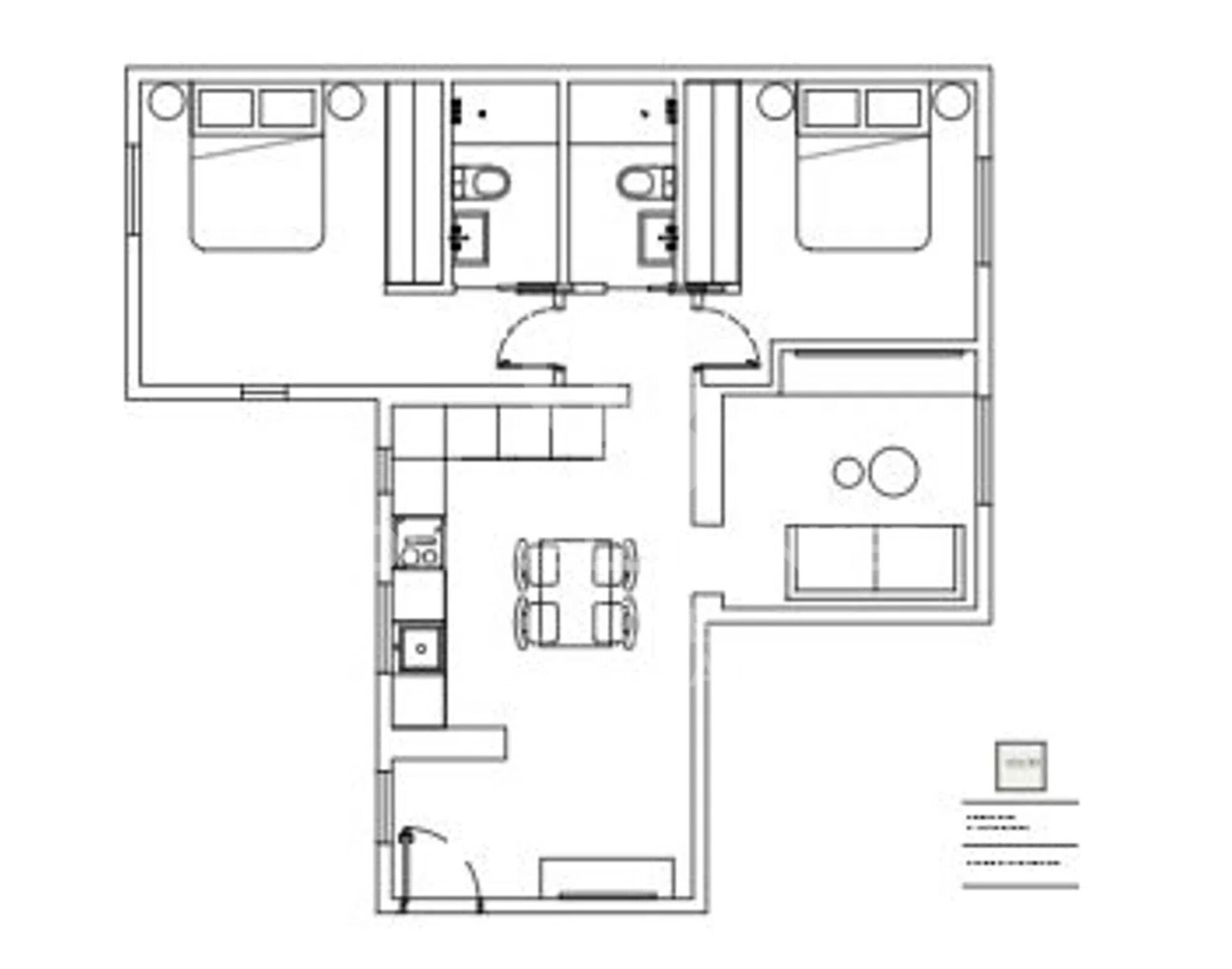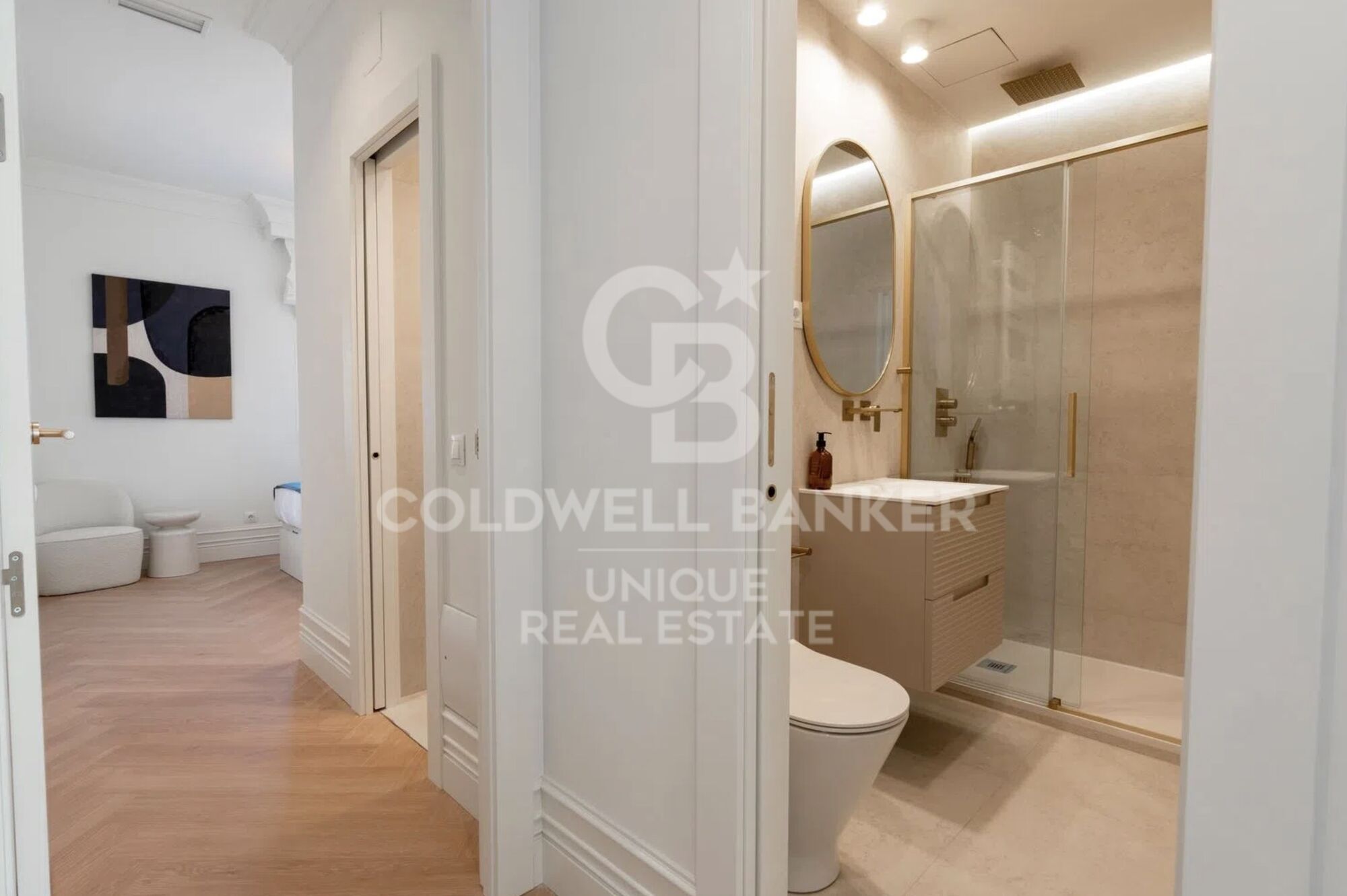 It offers 75 m² built and 70 m² usable space, with 2.9-meter-high ceilings, distributed across two spacious double bedrooms and two bathrooms, one of them en suite, ensuring privacy and comfort.