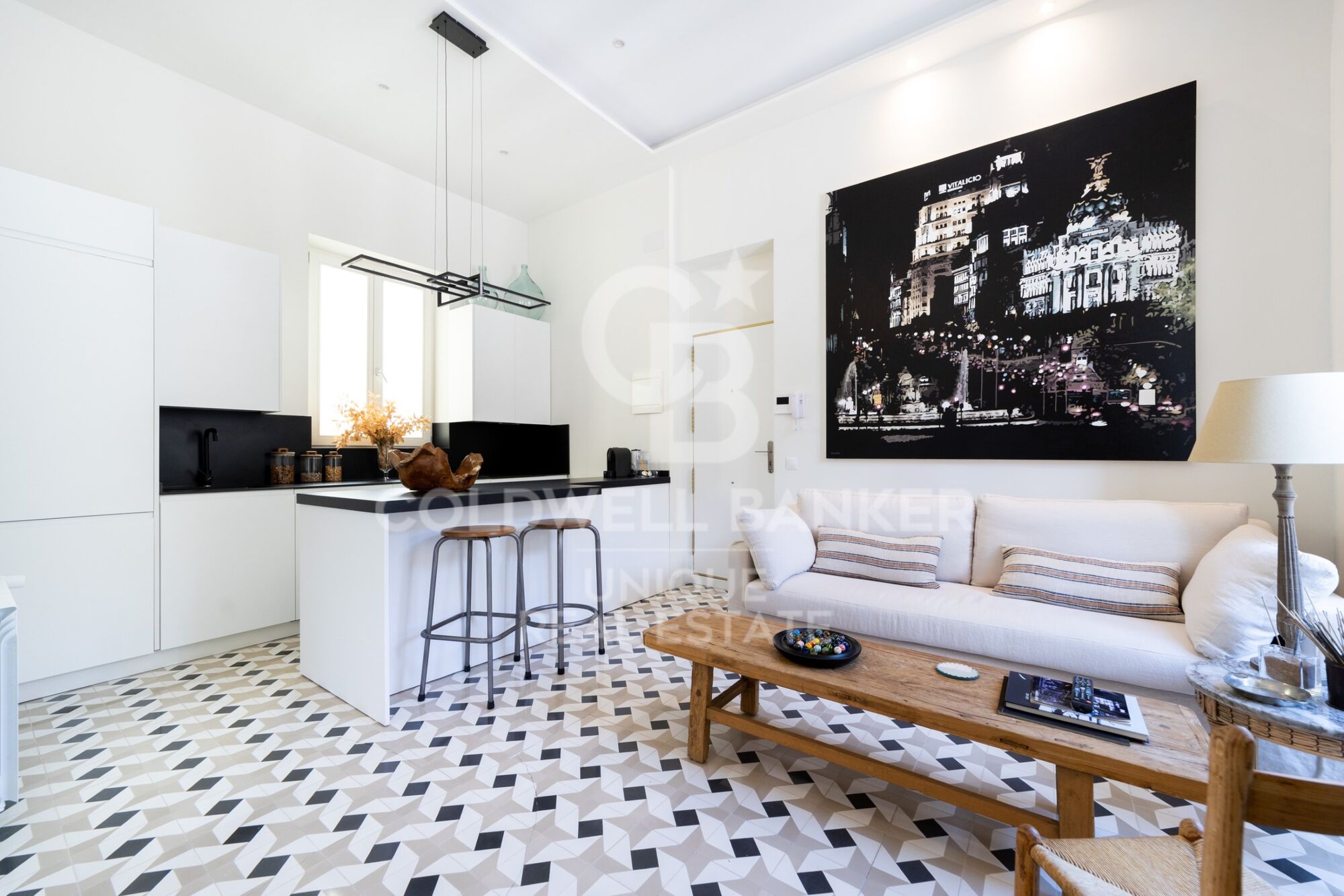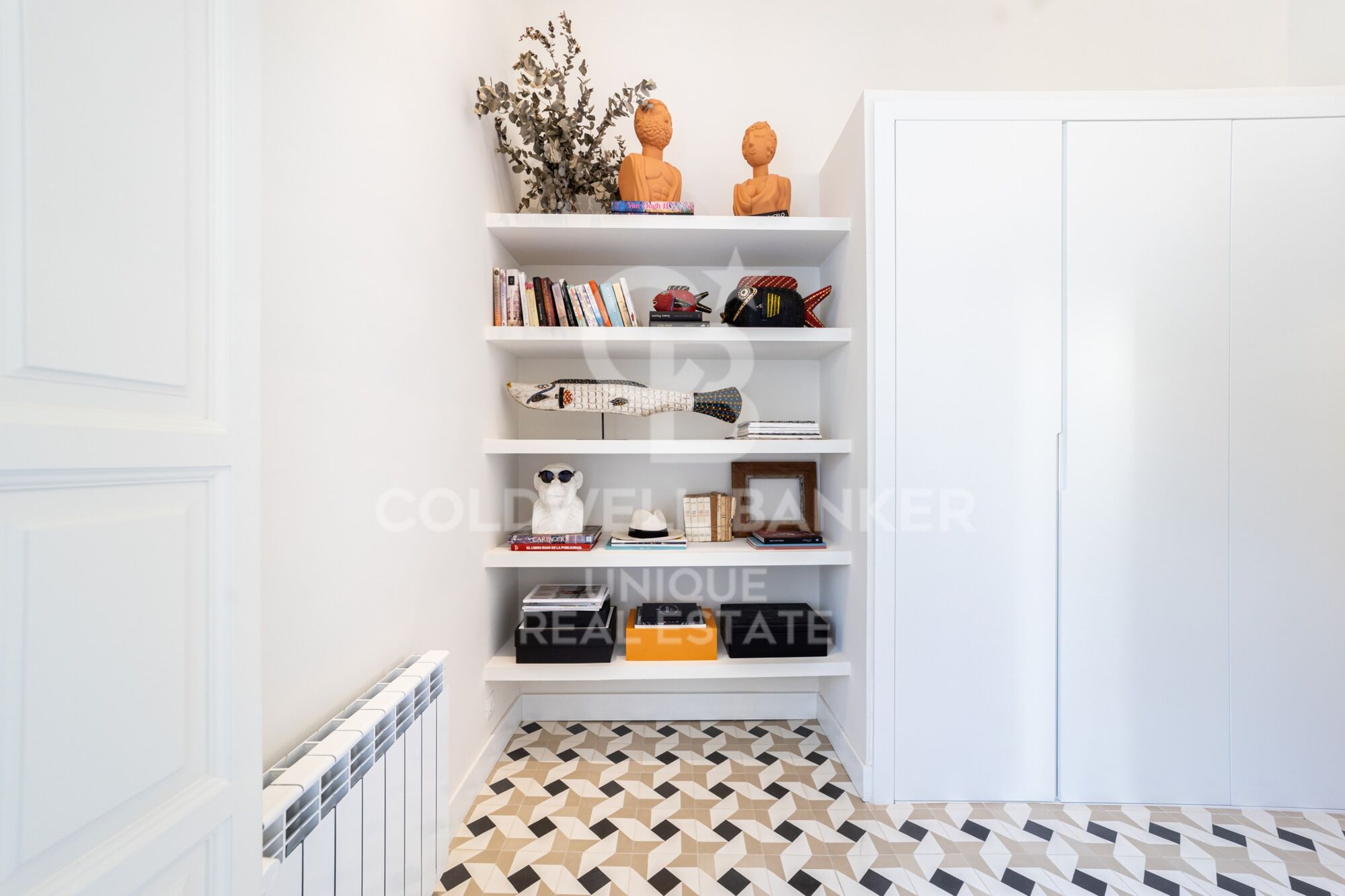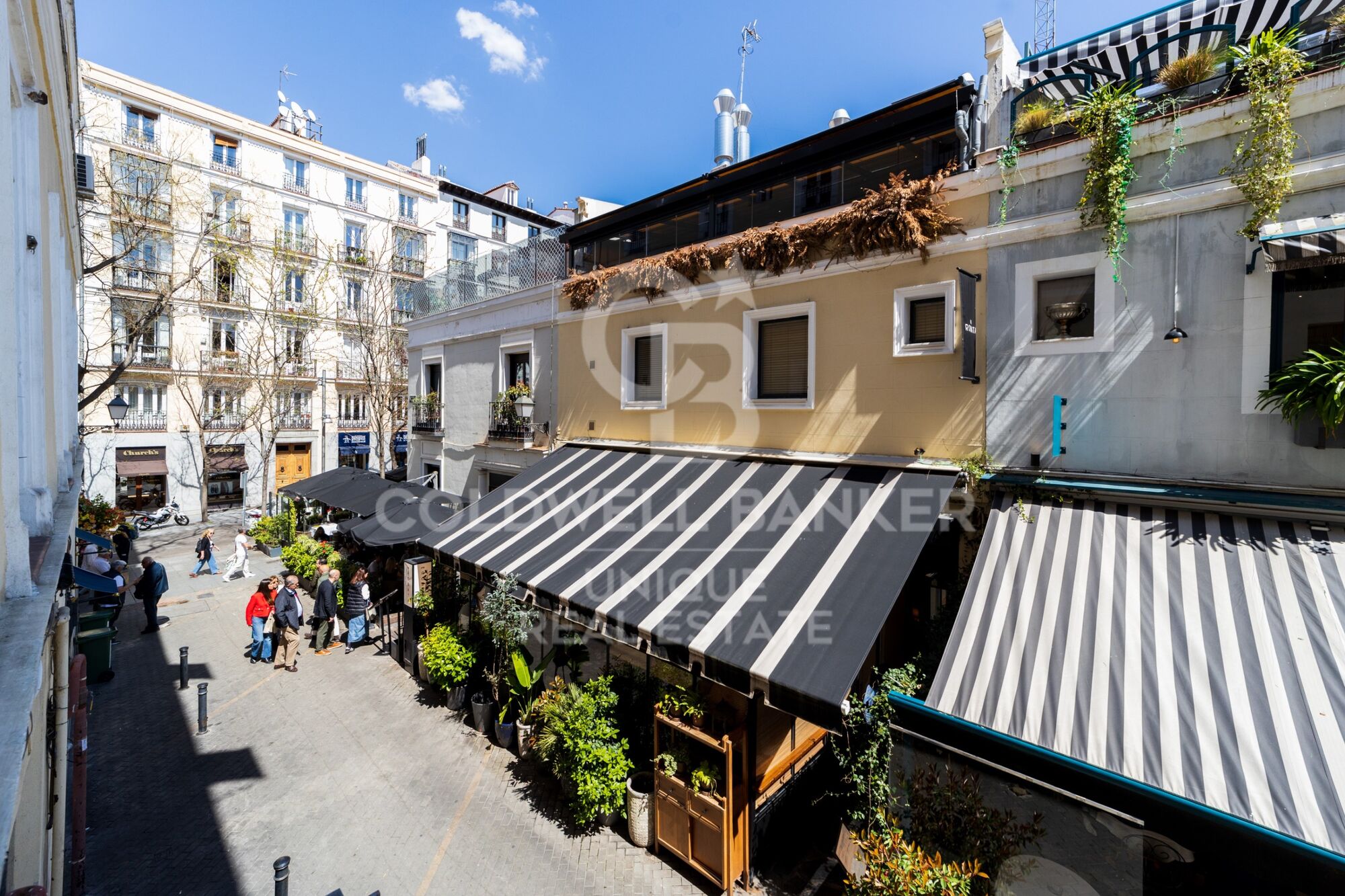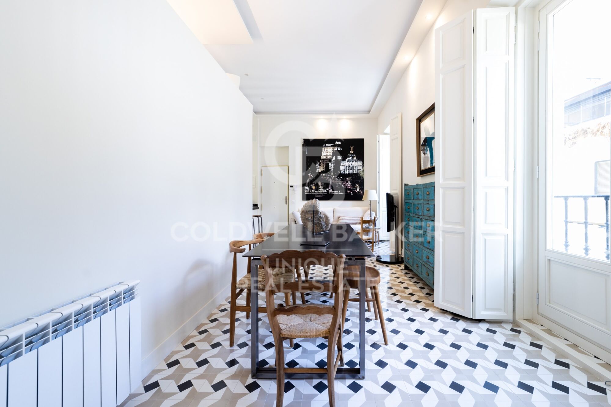 This elegant space combines an open plan design with a modern kitchen and a cosy living room that opens onto two balconies overlooking the charming alley of Jorge Juan, one of the most prestigious and coveted arteries of the city.