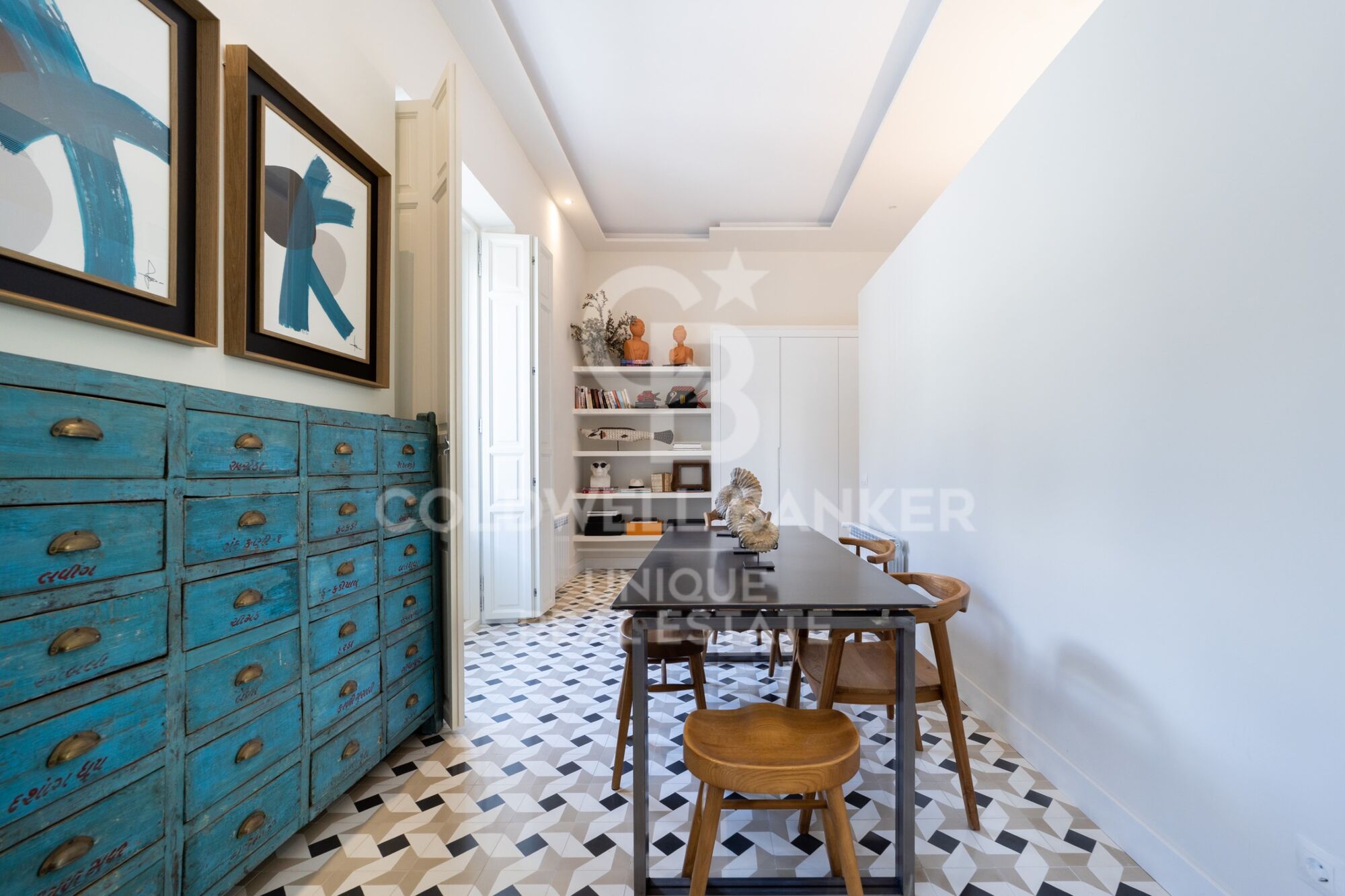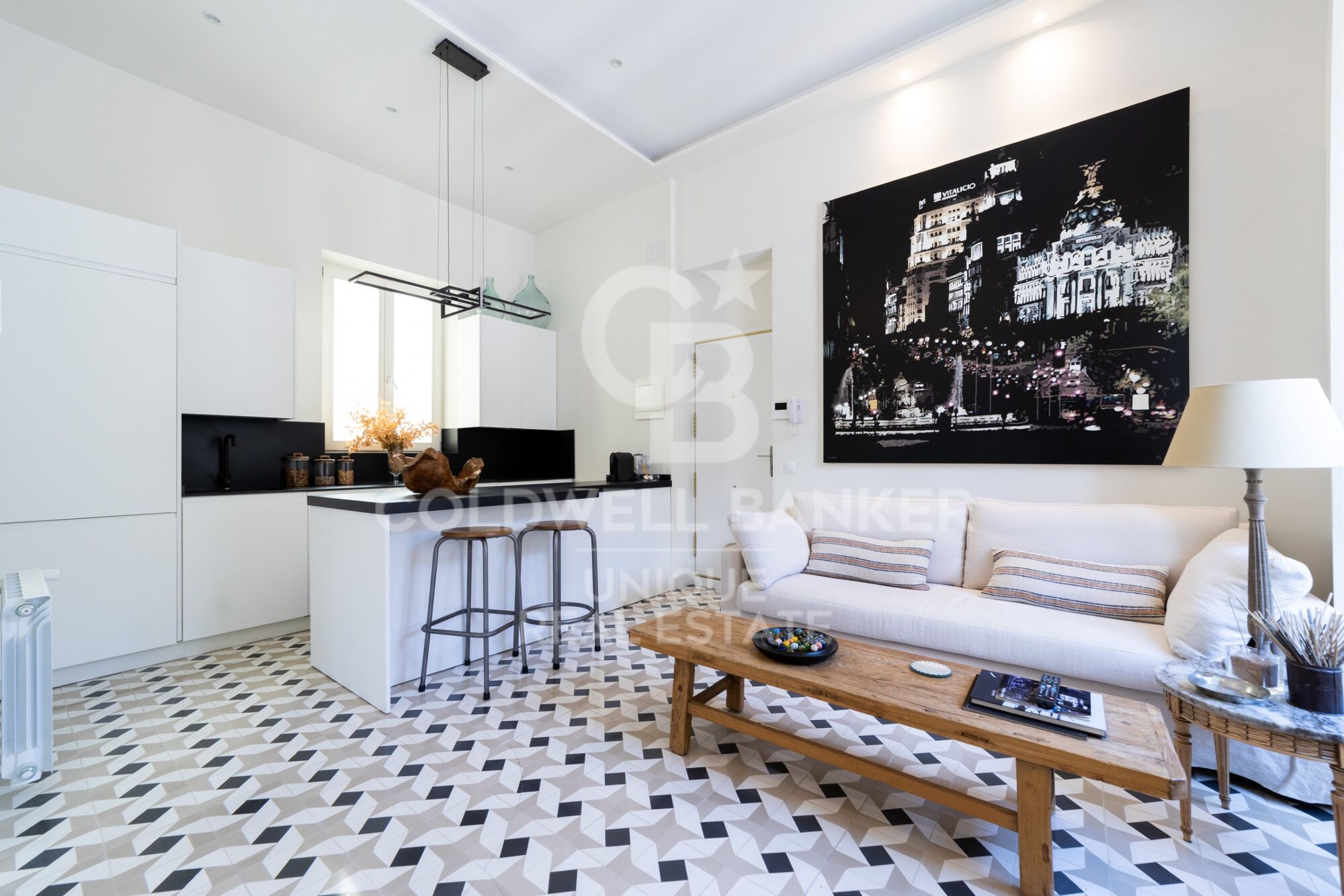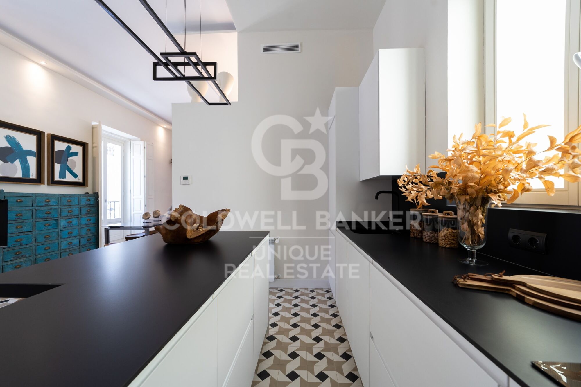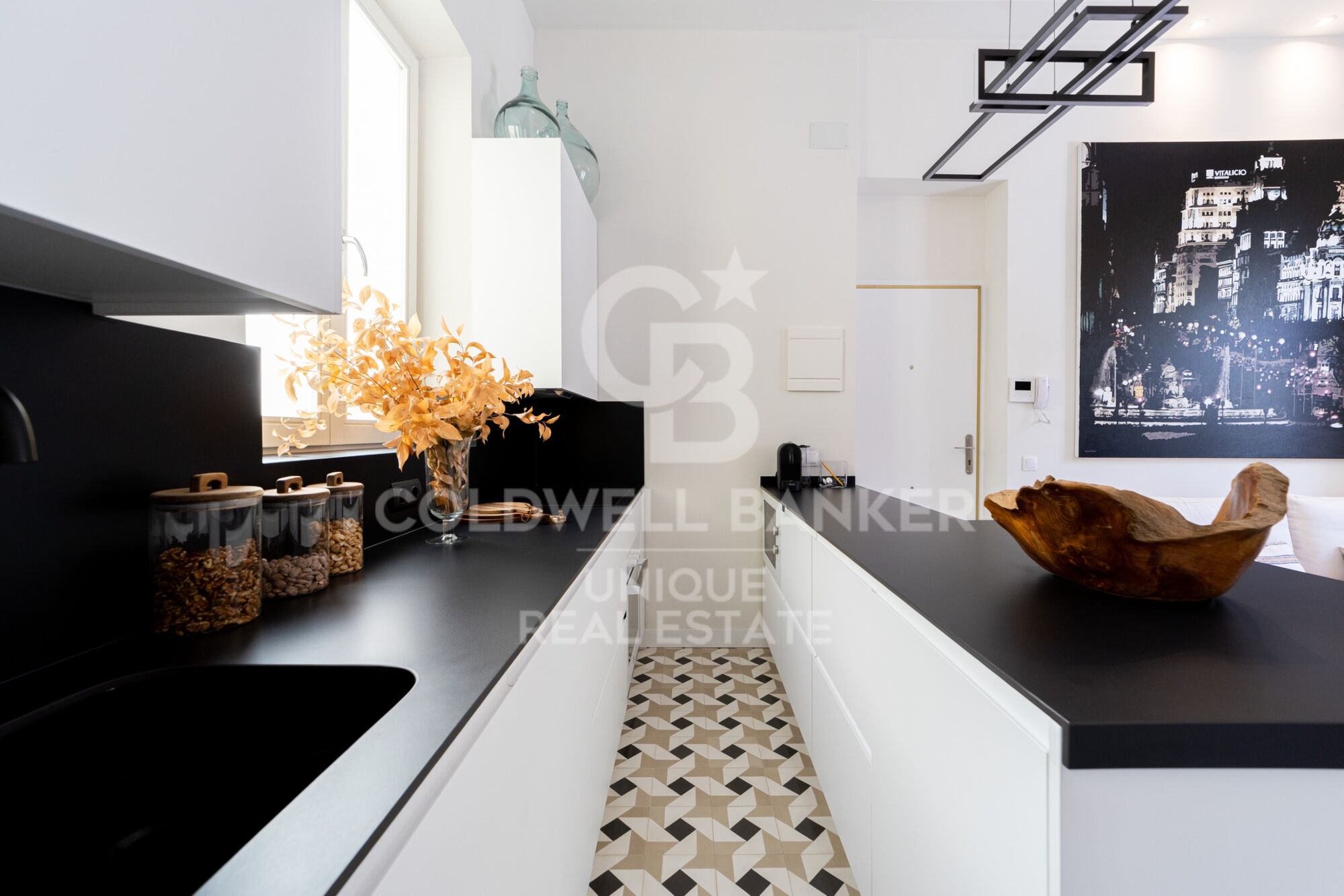 This elegant space combines an open plan design with a modern kitchen and a cosy living room that opens onto two balconies overlooking the charming alley of Jorge Juan, one of the most prestigious and coveted arteries of the city.
