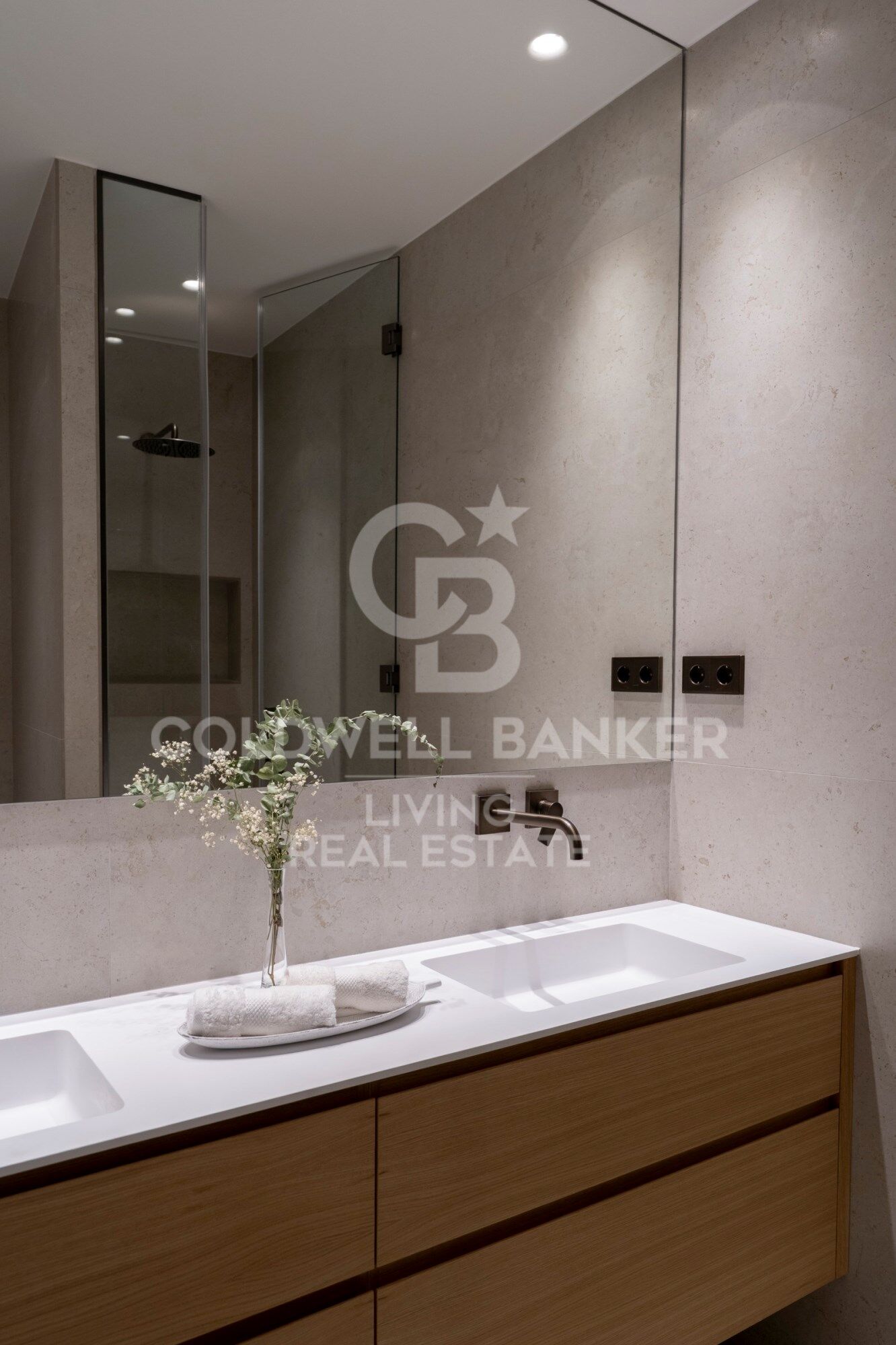 Baños en piedra caliza envejecida y porcelánicos de gran formato, con lavabos y platos de ducha realizados a medida. Griferías empotradas TRES en acabado bronzo, mamparas de vidrio de suelo a techo y sanitarios suspendidos Geberit.