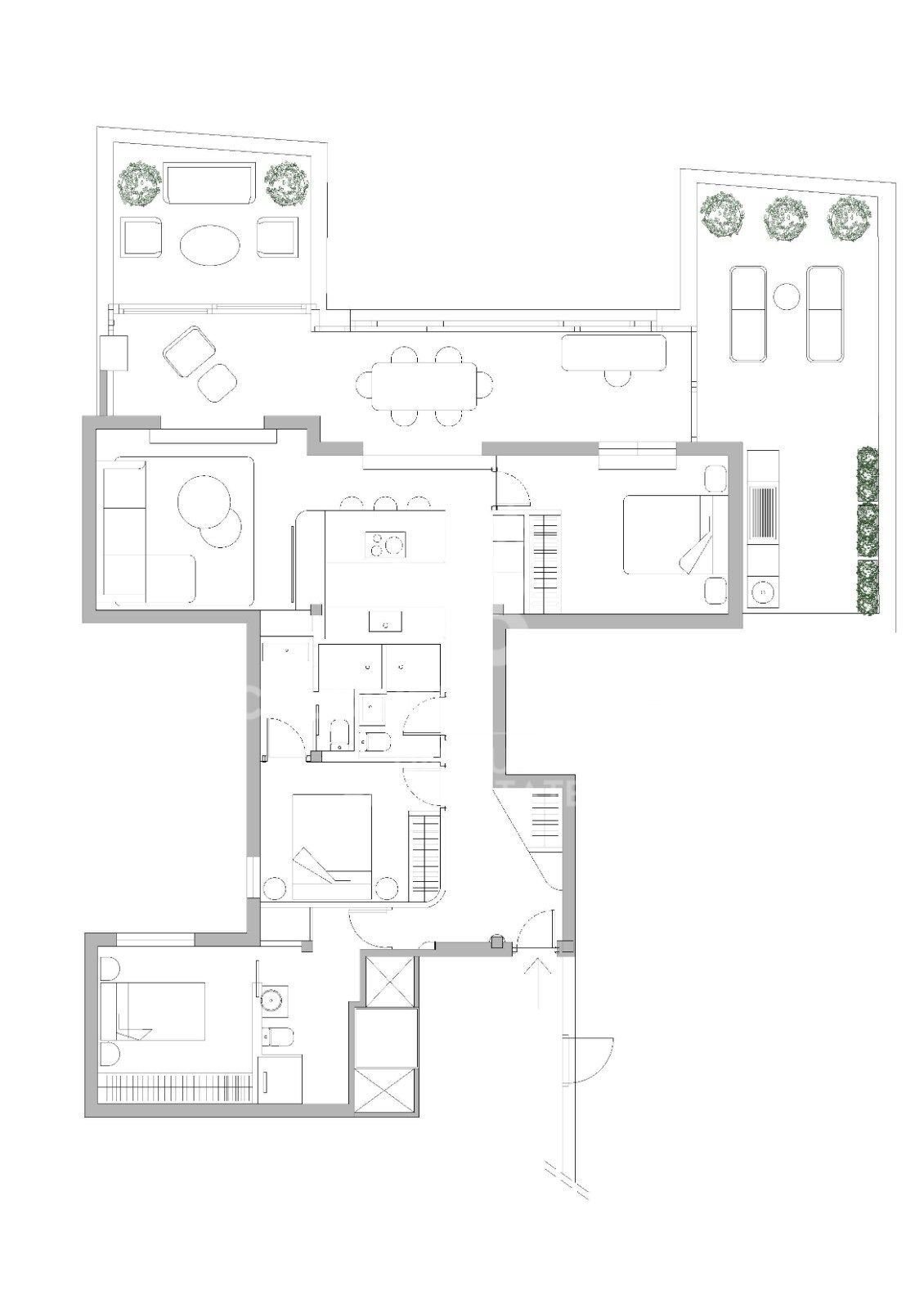 Access to the penthouse is through a representative entrance hall that leads to a spacious living-dining room with a decorative steam fireplace, ideal for creating a cosy and sophisticated atmosphere. The kitchen, with a contemporary design, is fully equipped with top brand appliances and has a three-year warranty. The sleeping area consists of three bedrooms, two of them en suite, and three full bathrooms, all with high quality finishes.