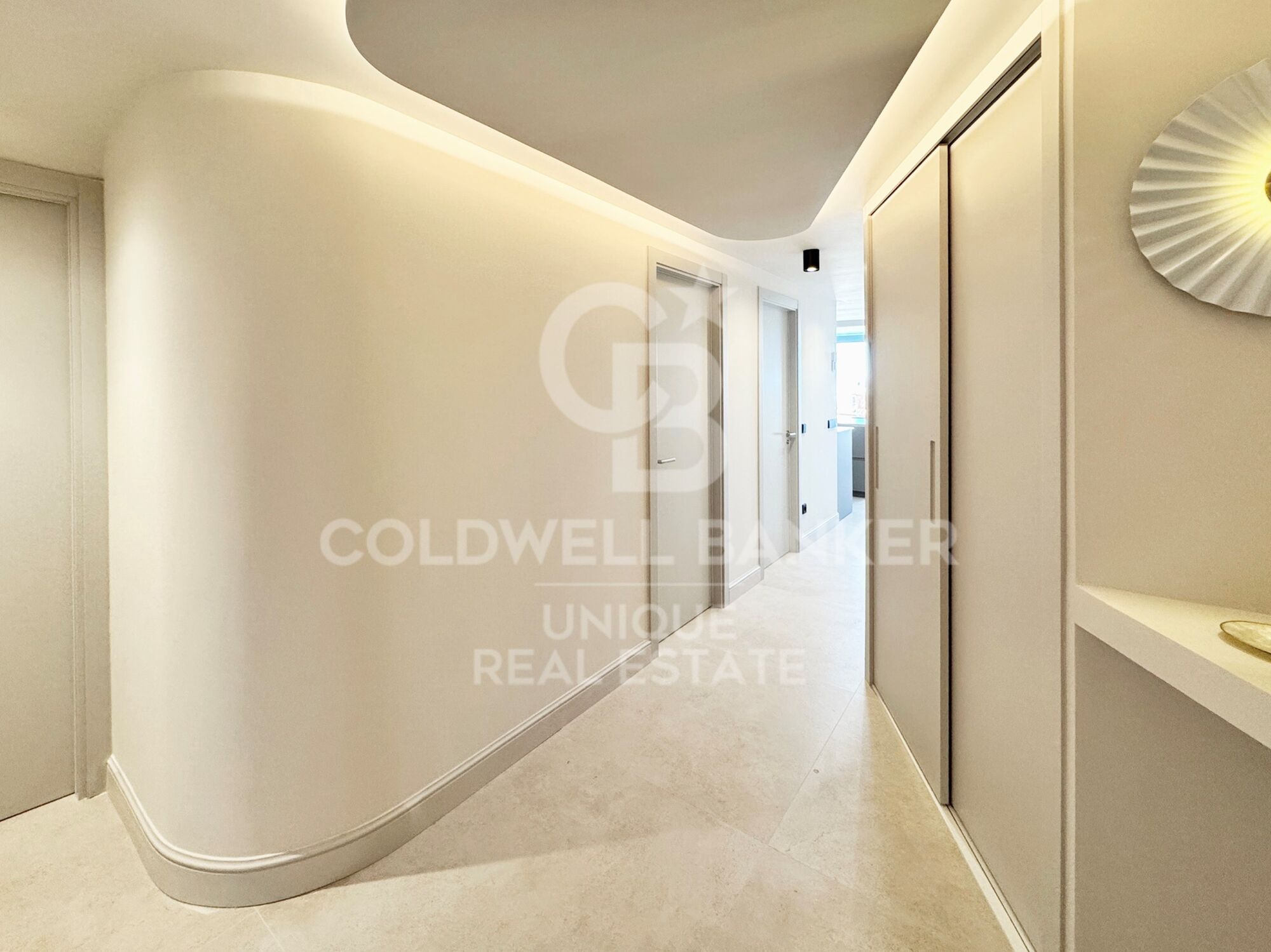 The interior design project has been carried out by a prestigious international studio, achieving a totally exterior and very bright home. Highlights include central heating, zone-controlled AIRZONE hot/cold pump system, high-efficiency thermal and acoustic insulation, thermal break enclosures and automatic wind-sensing awnings.