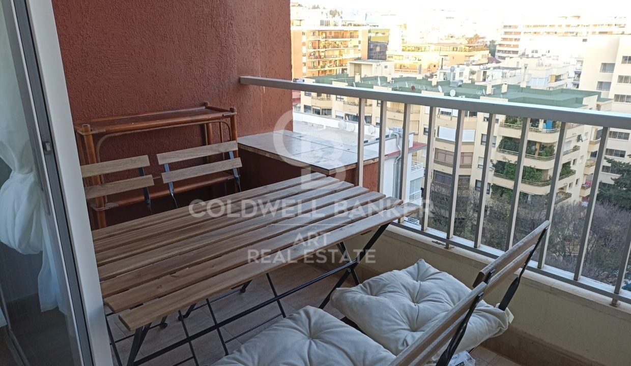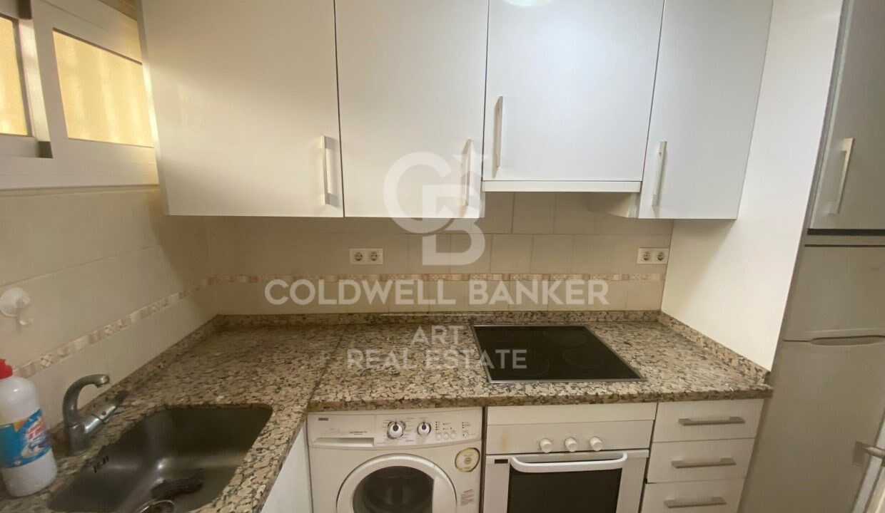 The property features a spacious and bright living room, one bedroom with a built-in wardrobe and direct access to the terrace, a fully renovated bathroom, and a separate, fully equipped kitchen. The layout is practical and designed for comfort and functionality.