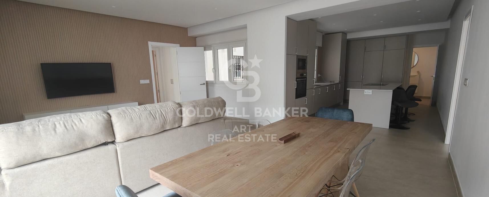 Located in one of the most privileged areas of Barcelona, near Plaza Francesc Macià, this high-end apartment offers a spacious and functional layout. The property covers 152.29 m², offering a master suite with a dressing room, two additional double bedrooms, a study, two full bathrooms, a guest toilet, a large living-dining room, and a fully equipped kitchen adjacent to the living room. In addition, it has a practical laundry area. This elegant apartment has been renovated with high-quality materials and luxurious finishes. The spaces have been carefully designed with a practical and intelligent layout that separates the rest areas from the kitchen and dining areas, providing unparalleled privacy. The large spaces, all with large windows, allow natural light to flood every corner, creating a bright and welcoming atmosphere. The living-dining room, with an area of 31.72 m², is one of the most pleasant spaces, with two large windows that flood the space with natural light, and the ceilings adorned with a plastered Catalan vault that adds a touch of classic elegance. The kitchen is equipped with the latest appliances, while the natural oak laminate parquet floors and the beige and natural wood tones bring warmth and comfort to every space. The bedrooms, away from the common areas, ensure a peaceful retreat. The master bedroom, with an area of 15.52 m², is a suite that includes a dressing room and a private bathroom. The high-quality finishes, such as the natural oak laminate parquet, provide warmth and elegance. The suite has custom wardrobes, lacquered doors, and minimalist-style windows with thermal break technology, ensuring comfort and energy efficiency. The two double bedrooms are spacious and bright, thanks to the large windows that allow natural light to enter. These bedrooms share a full bathroom equipped with matte black built-in taps, resin shower trays, and micro cement-effect porcelain floors, combining functionality with a modern and elegant design. With an individual heating system using aluminum radiators, the home offers a warm and cozy atmosphere in winter. In summer, the ducted air conditioning system, with a high-efficiency heat pump, keeps the space cool and comfortable. This versatile system allows the temperature of each room to be regulated independently, ensuring comfort year-round and reducing CO2 emissions. #ref:CBES2365