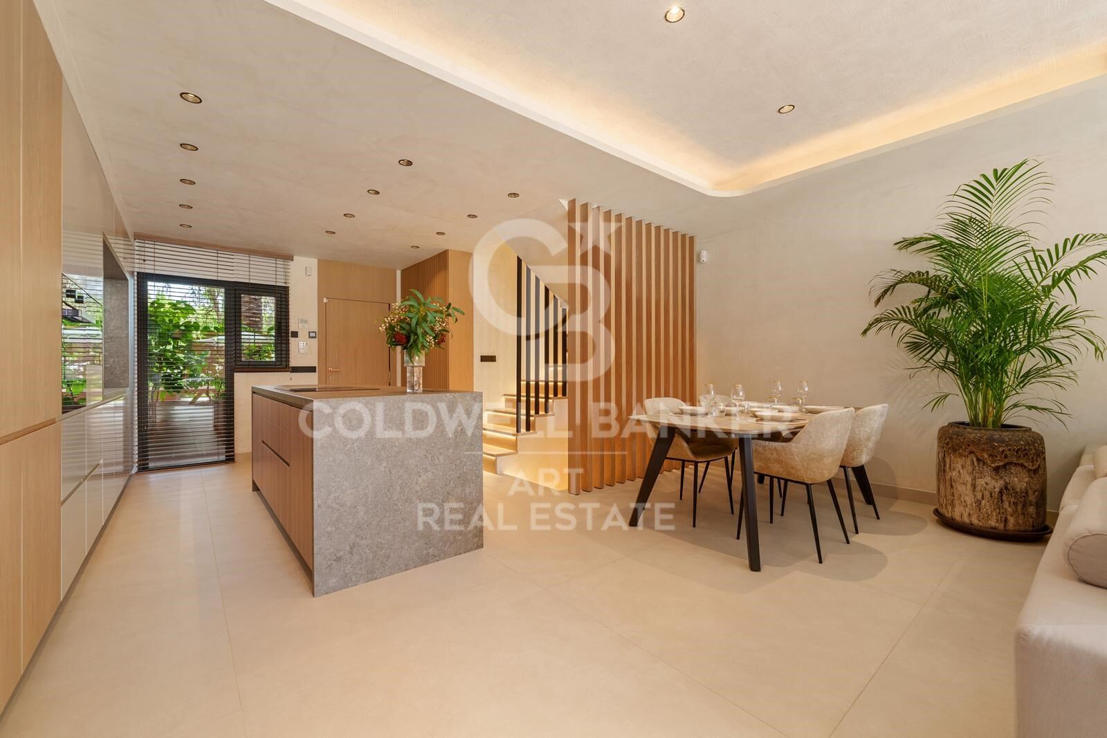 The open-plan main floor connects a sleek modern kitchen with top-quality appliances to a spacious dining and living area. Floor-to-ceiling doors lead out to a covered terrace and a private garden, creating a seamless indoor-outdoor lifestyle. Clean lines, abundant natural light, and contemporary finishes define the aesthetic, giving the entire home a refined yet relaxed atmosphere.