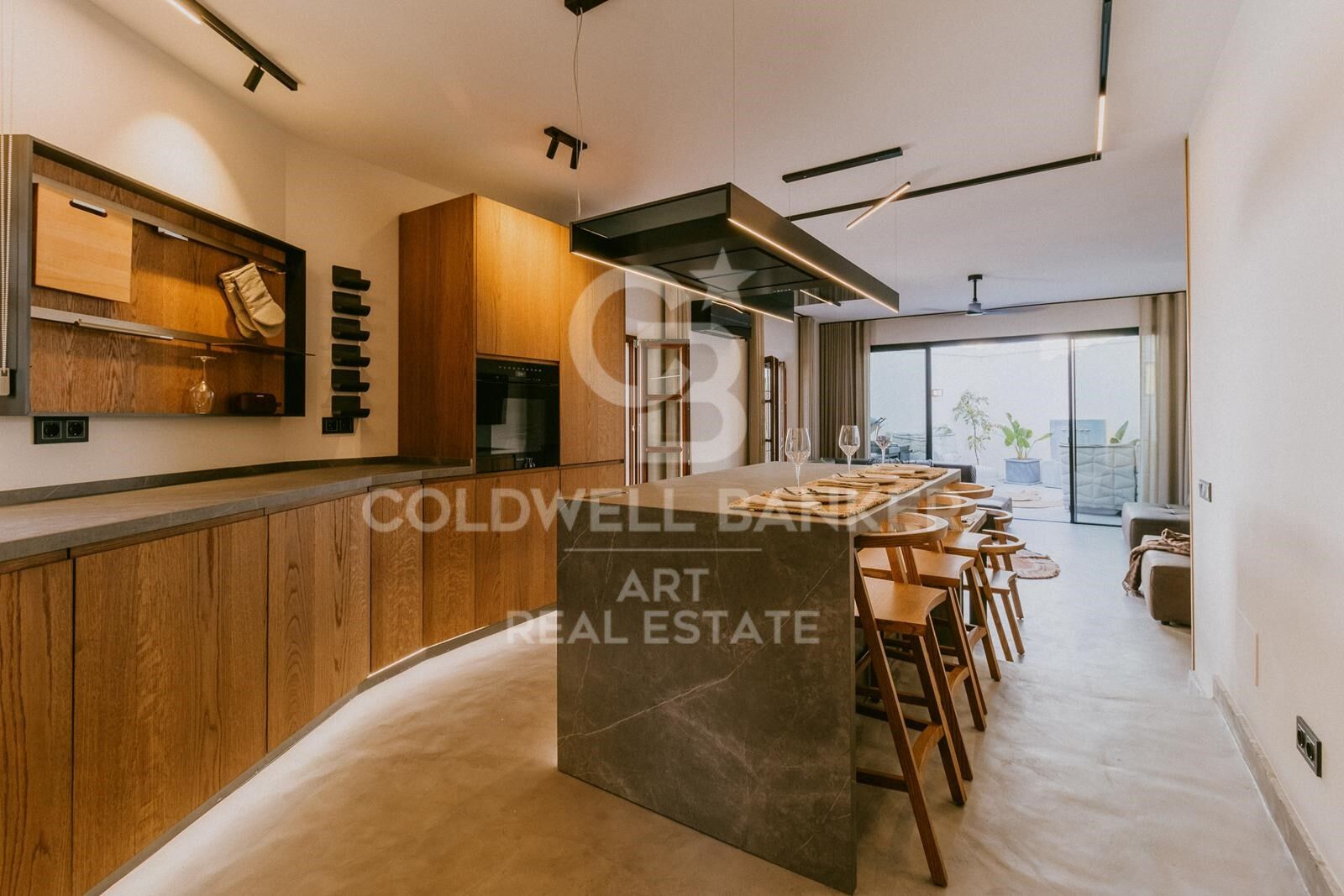 The spacious open-concept living-dining room is flooded with natural light, creating a warm and elegant atmosphere, perfect for both daily relaxation and entertaining. Large glass doors connect to a charming private Andalusian-style patio, a true oasis to enjoy the outdoors.