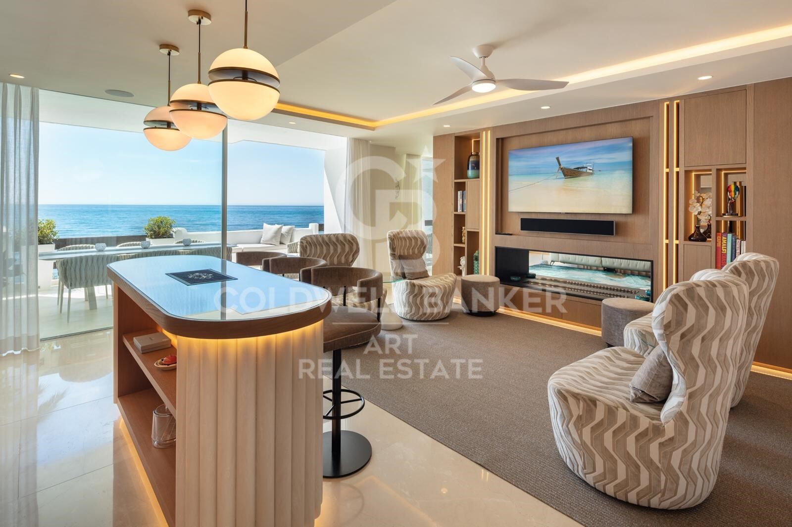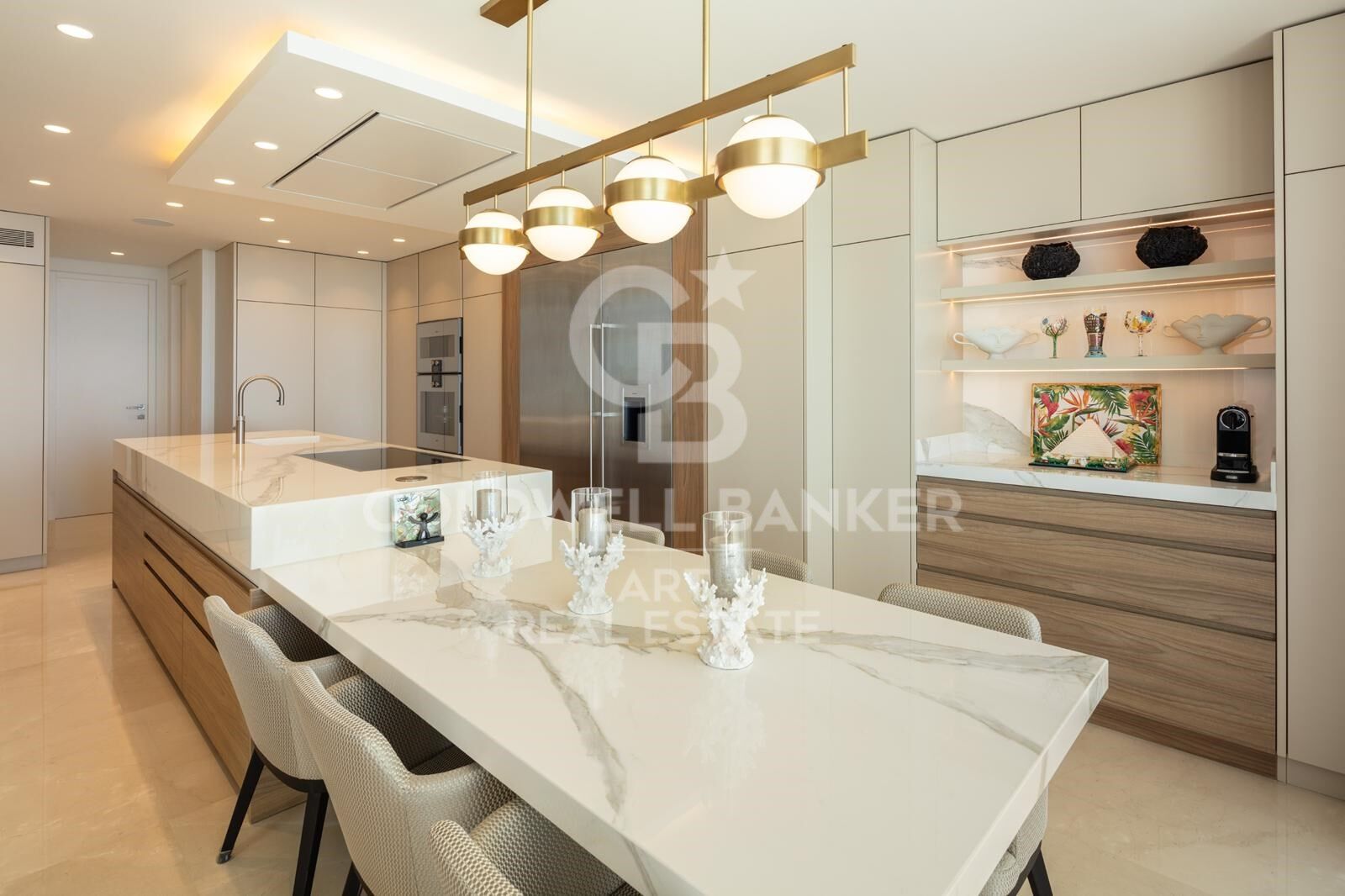 The state-of-the-art kitchen comes fully equipped with high-quality Gaggenau appliances, including an American-style fridge/freezer, integrated oven, wine cooler, and ample storage space. The dining area has been perfectly integrated to allow for amazing sea views. The apartment opens up to two living areas, one with a spacious bar and another for pure relaxation.