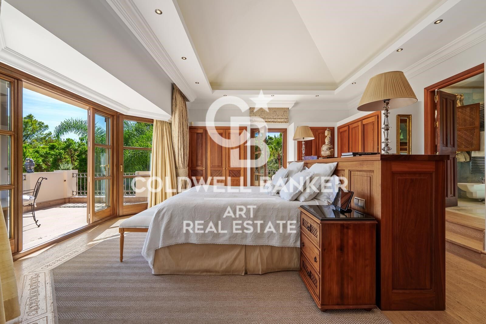 This exceptional Andalusian-style villa is presented in excellent condition and occupies a privileged position in Las Lomas del Marbella Club, in the heart of the prestigious Golden Mile of Marbella. Surrounded by 20,000 m² of lush forest, the property offers unparallelled privacy and tranquillity, a rare feature in such a central location. Its proximity to the renowned Puente Romano Hotel, to local services, the beach and prestigious schools guarantees a lifestyle of comfort and exclusivity. The villa, located on a generous plot of 1,811 m², has an impressive built area of 712 m² and 133 m² of terraces. It consists of six large bedrooms, seven bathrooms and two guest toilets, the property is designed for both family life and entertainment. The master bedroom stands out especially for its generous dimensions. The residence also has an independent apartment, ideal for guests or staff, and a basement that includes a movie theatre, cellar, games room, gym and office. Outdoor life is one of the strengths, with beautifully landscaped private gardens, a heated saltwater pool and panoramic views of the sea, the mountains and the countryside. The magnificent outdoor beach bar has a fully equipped kitchen, barbeque, sound system and an outdoor lounge, perfect for entertainment throughout the year. A covered car park offers safe space for three vehicles, and the property benefits from double glazing, underfloor heating throughout the house, air conditioning, home automation system and solar panels for greater energy efficiency. Security and comfort are paramount, with amenities such as security entrance, surveillance cameras, alarm system, video intercom and automatic irrigation. Other features include laundry room, laundry room, storage room, fitted wardrobes, guest room, water tank, covered and private terraces, and optional furniture. The classic Andalusian charm of the villa is complemented by the highest standards of modern luxury, making it a truly exceptional offer under exclusive. #ref:CBSH1329