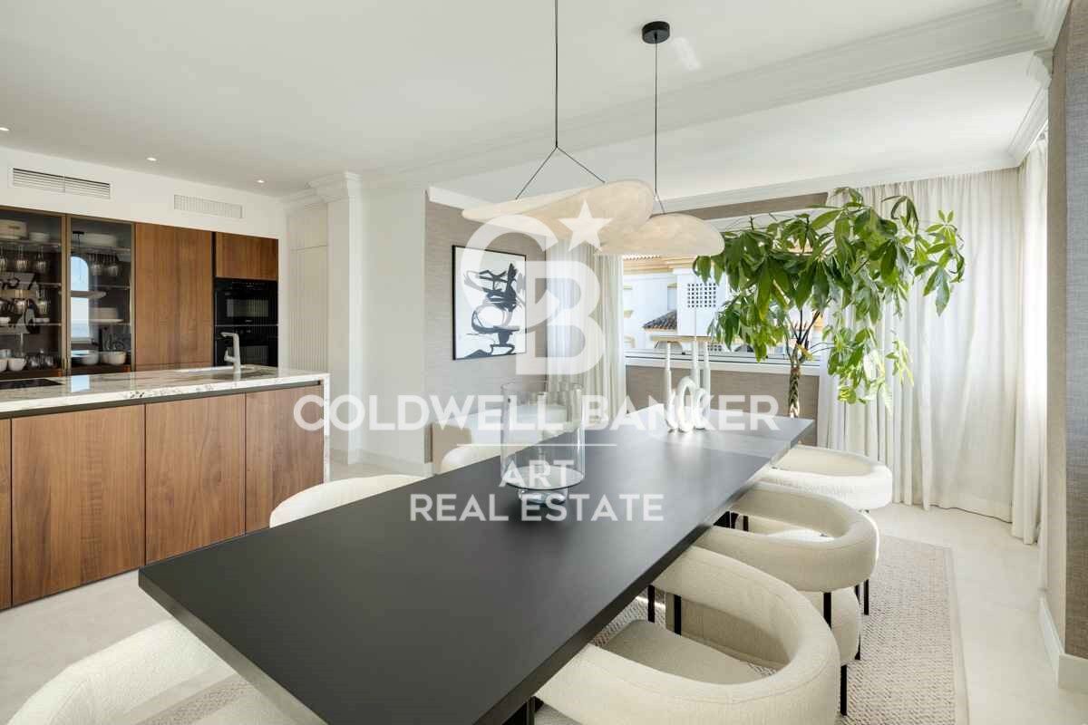 Located on Marbella's exclusive Golden Mile, this luxurious three-bedroom duplex apartment is part of the prestigious, gated community of Las Lomas del Rey known for its prime location, privacy, and outstanding communal facilities. Recently renovated to an exceptional standard, the apartment offers 276sqm of total space, including approx. 114sqm of private terraces with panoramic views of La Concha and lush gardens. The two-level layout features elegant living areas, a designer kitchen with Siemens appliances, and three en-suite bedrooms, one currently used as an office. The upper level hosts the serene master suite, complete with terrace access and a spa-like bathroom. Modern comforts include underfloor heating, Airzone climate control, LED lighting, smart home automation, integrated music system, and electric blinds blending comfort, tech, and style. Additional perks include a large private parking space with EV charging and a storage room. Lomas del Rey offers residents access to three pools (including a heated one), a full gym, and beautifully maintained grounds. The location is just minutes from the beach, Puente Romano, top international schools, elite golf courses, and Marbella's key attractions. Offering a peaceful, residential feel with easy access to everything the Golden Mile has to offer, this is a rare opportunity to own a turnkey luxury home in one of the most desirable enclaves on the Costa del Sol. #ref:CBSH1018