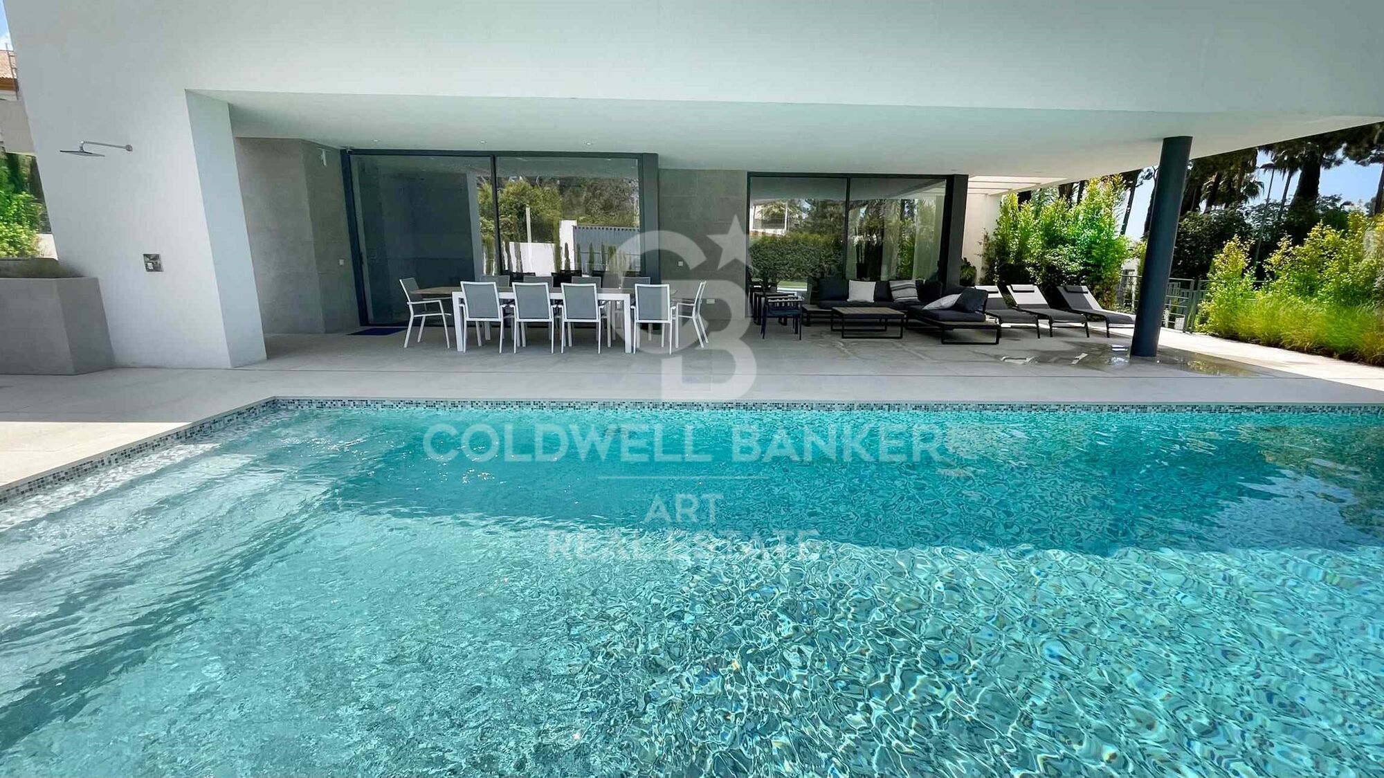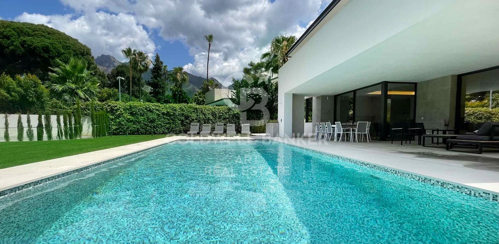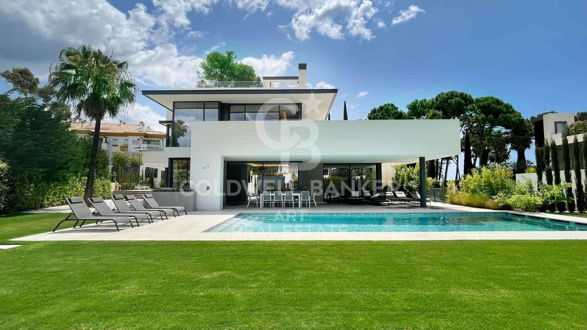Discover this spectacular contemporary-style villa, ideally located in the heart of Marbella's prestigious Golden Mile, in the sought-after area of Nagüeles. The property boasts 5 elegant bedrooms and 5 full bathrooms, plus a guest toilet, spread across three levels connected by a private elevator that adds both comfort and sophistication.
