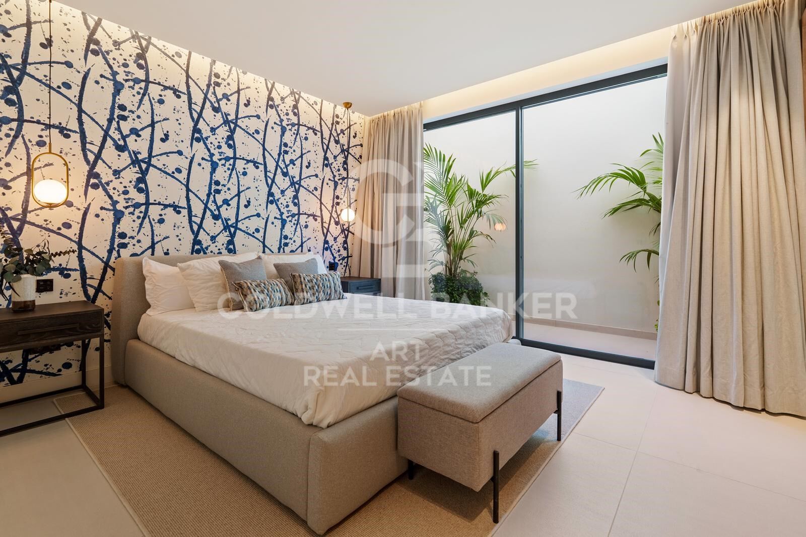 Magnificent penthouse, fully renovated and brand new, a true gem in the prestigious Les Corts district - Av. de Madrid. Includes a parking space in the same building, with a built area of 116 m² and a spectacular 100 m² L-shaped terrace, a privileged space to enjoy the sun all day, host social gatherings or simply relax in great privacy with views of Camp Nou and the sea. Design and finishes: The renovation has been carried out with top-quality materials and meticulous attention to detail. The open-plan kitchen combines functionality and style: marble bar, stainless steel surfaces and a matching decorative hood. Equipped with Siemens state-of-the-art appliances (fridge, oven, microwave, dishwasher and ceramic hob). The bright and welcoming living-dining room features a gas fireplace that adds warmth and character. Carefully selected furniture combines contemporary design pieces with restored elements, such as a marble table with cane chairs, creating a unique and sophisticated atmosphere. Layout Master bedroom with walk-in closet and en-suite bathroom. Two double bedrooms with built-in wardrobes and direct access to the terrace. Second full shared bathroom. All rooms benefit from natural light and access to the terrace, enhancing the sense of spaciousness and connection with the outdoors. Equipment and comfort Air conditioning and central heating. Electric blinds in all rooms. Designer lighting and lamps in every space. High-end furniture included in the sale. A unique opportunity to live in a penthouse and enjoy an exclusive home. #ref:CBES2745